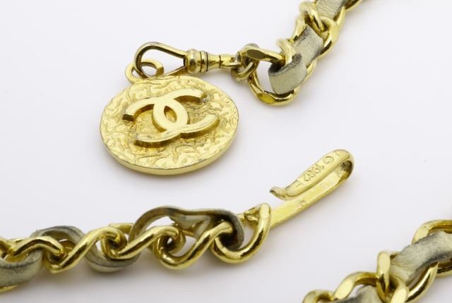 One Chanel Gold-tone Metal Woven Chain and Beige Leather CC Charm Belt. Item is sold AS-IS. All available information is listed in the description and shown in the photo. A classic Chanel statement chain belt made of massive gold-tone metal with intertwined beige leather, an interlocking CC medallion charm and hook closure signed with CHANEL logo.