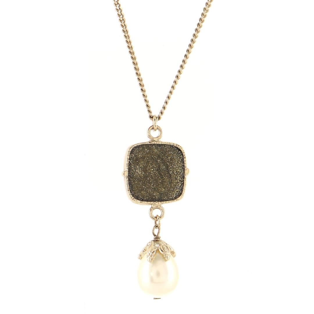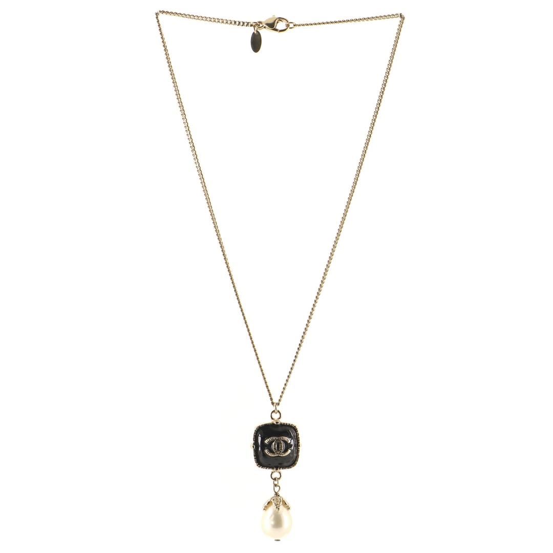 One Chanel Gold-tone Metal with Enamel and Faux Pearl Drop CC Pendant Necklace. Item is sold AS-IS. All available information is listed in the description and shown in the photo. Chanel CC Pendant Necklace features a black pendant with interlocking CC logo, faux pearl drop, gold-tone long chain and lobster clasp closure.