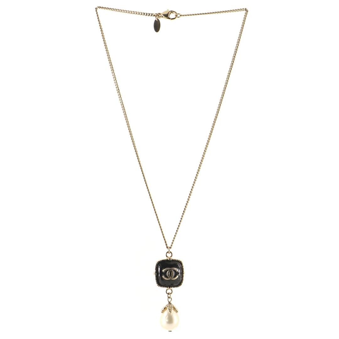 One Chanel Gold-tone Metal with Enamel and Faux Pearl Drop CC Pendant Necklace. Item is sold AS-IS. All available information is listed in the description and shown in the photo. Chanel CC Pendant Necklace features a black pendant with interlocking CC logo, faux pearl drop, gold-tone long chain and lobster clasp closure.