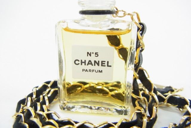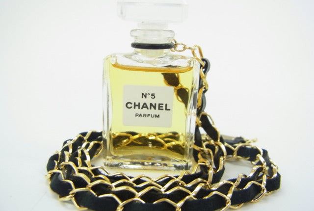 One Chanel Gold-tone No.5 Perfume Bottle Charm Necklace. Item is sold AS-IS. All available information is listed in the description and shown in the photo. Chanel Necklace features gold-tone chain entwined with black leather, a small Chanel No.5 perfume bottle pendant and lobster clasp closure.