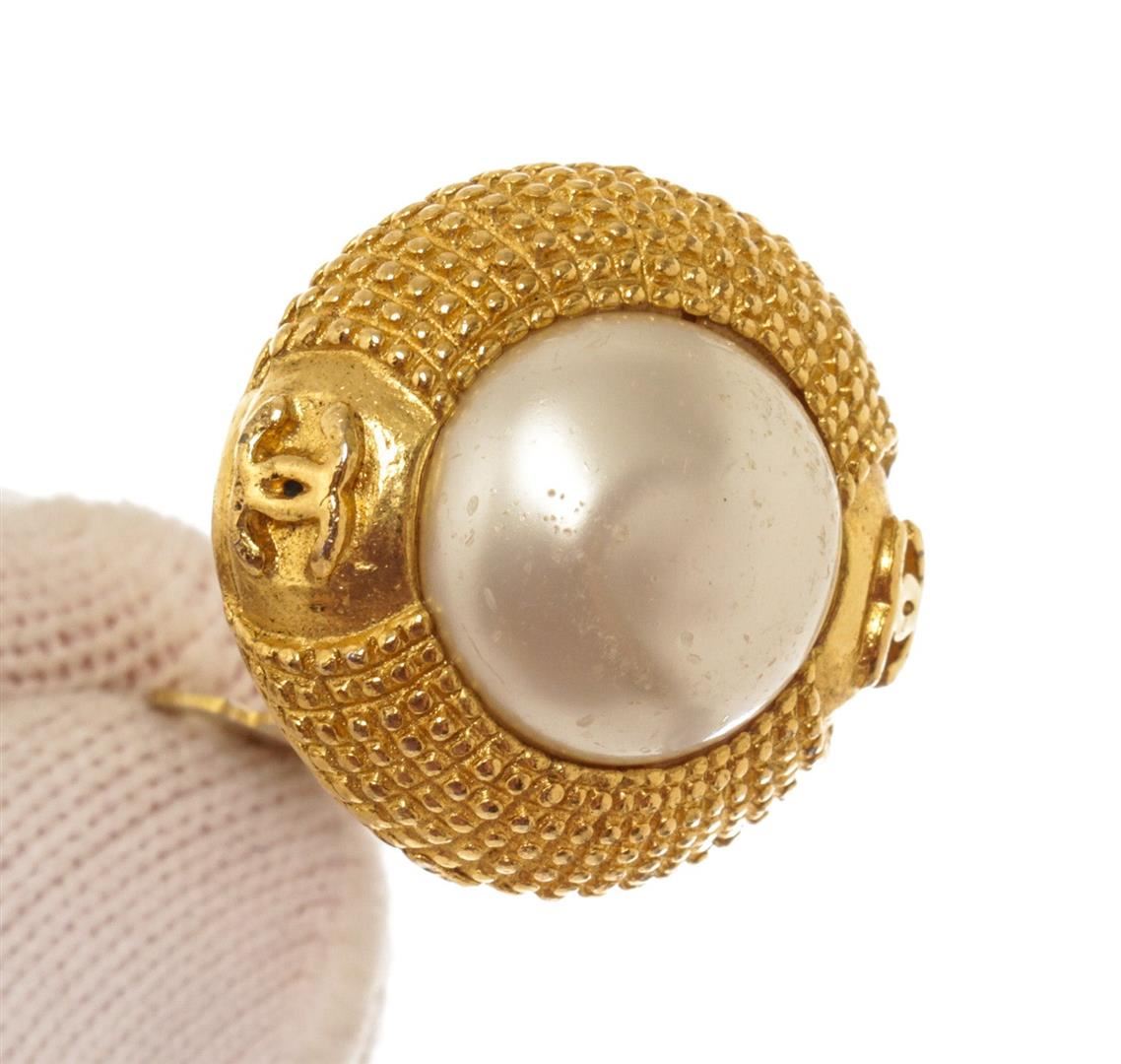 One Chanel Gold-tone Round Pearl Clip-on Earrings. Item is sold AS-IS. All available information is listed in the description and shown in the photo. Chanel Gold-tone Round Pearl Earrings feature pearl at the center, interlocking CC logo, etched accent and gold-tone hardware.
