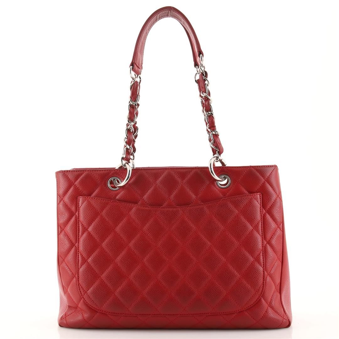 One Chanel Grand Shopping Tote Quilted Caviar. Item is sold AS-IS. All available information is listed in the description and shown in the photo. Chanel Grand Shopping Tote Quilted Caviar. Odor in interior. Creasing on exterior, darkening on rear, opening trim and handles. Wear on base corners and in interior, pilling on zipper tape. Marks in interior, scratches on hardware.