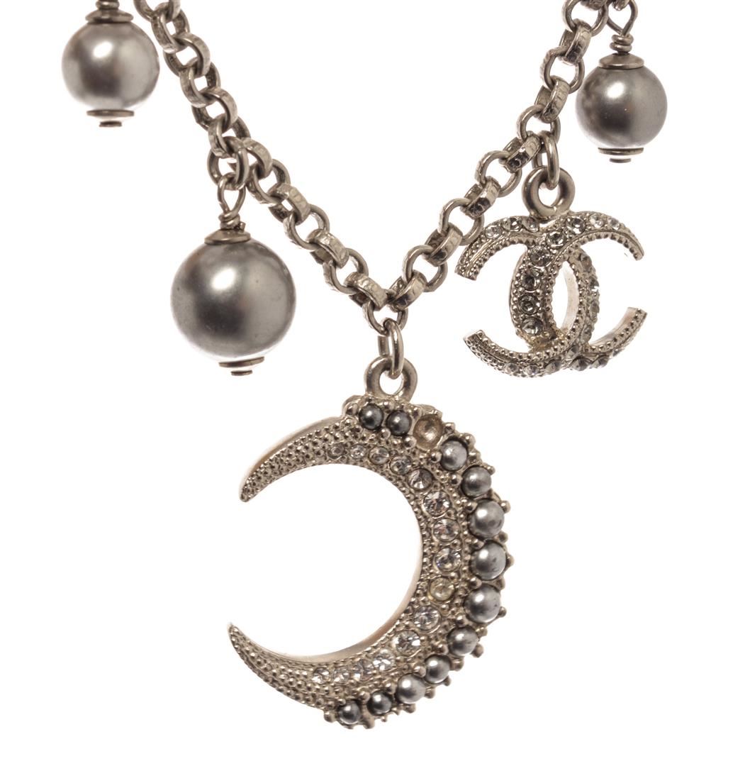 Chanel Gray Faux Pearl Moon Bracelet. All available information is listed in the description and shown in the photos. Chanel Gray Faux Pearl Moon Bracelet with siler-tone hardware, double c, with faux pearls and an interlocking cc charm while a lobster clasp completes it.