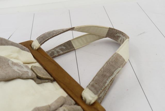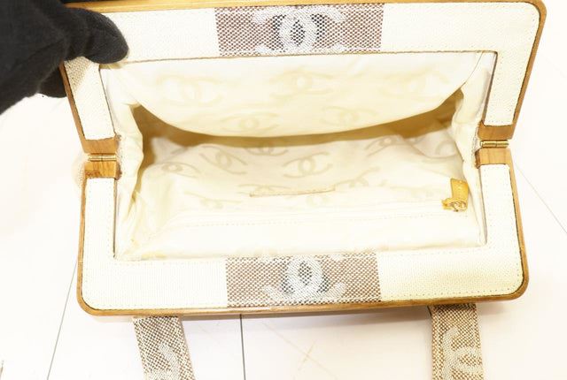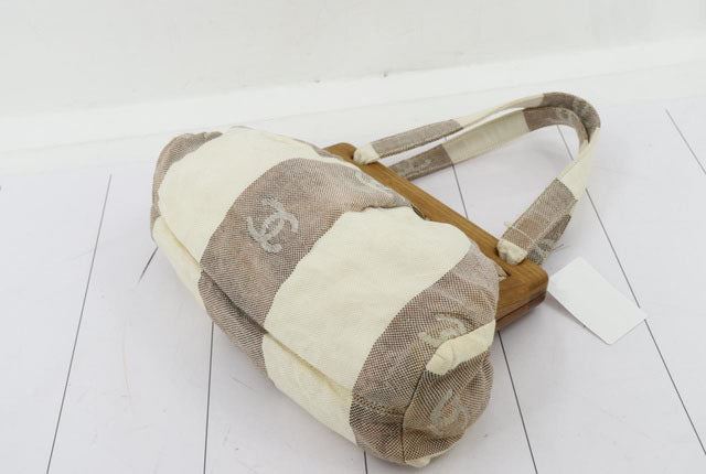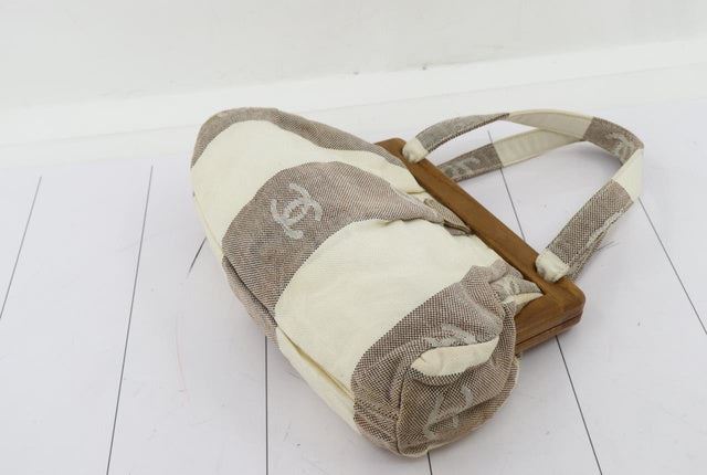 Chanel shoulder bag in grey and ivory striped linen and a wooden frame opening. This bag has a cute beach/nautical themed design with a wooden frame opening that can be pulled open with tabs on the front and back of the bag. The linen has large CC logos w
