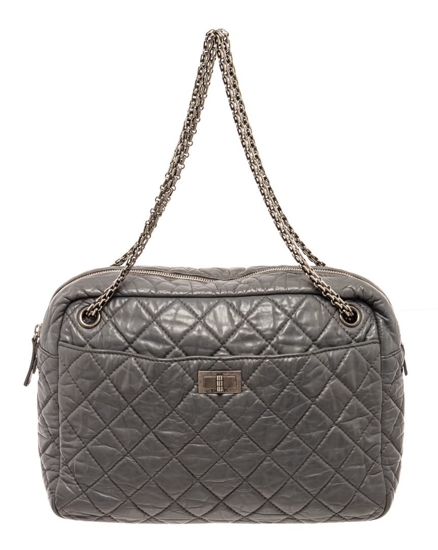 Chanel Grey Leather 2.55 Large Reissue Camera Shoulder Bag. All available information is listed in the description and shown in the photos. Chanel Grey Leather 2.55 Large Reissue Camera Shoulder Bag with silver-tone hardware, chain-link shoulder straps, dual exterior pockets, leather lining & three interior pockets, interlocking cc logo & quilted pattern, zip closure at top. Height: 9.25", Width: 12", Depth: 3.5" / 23.49 x 30.48 x 8.89 CM