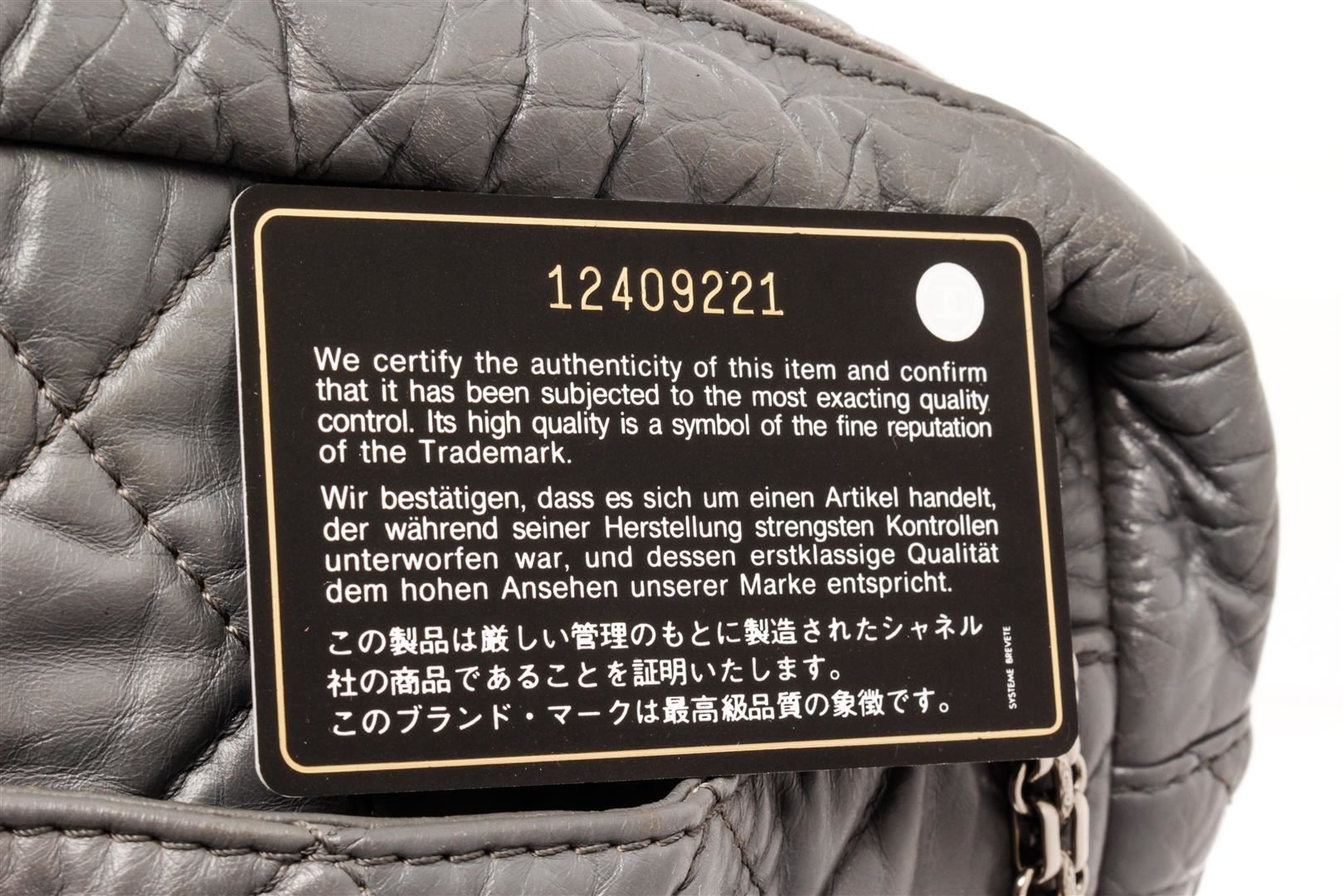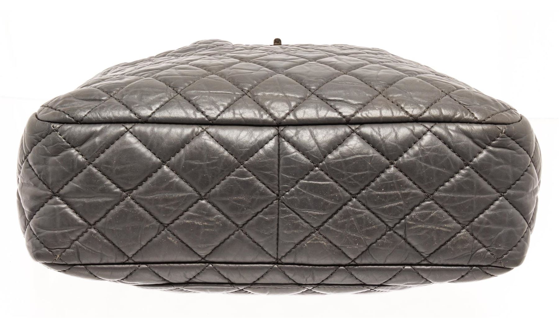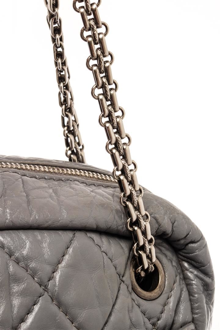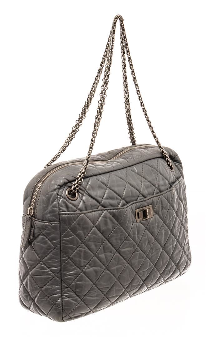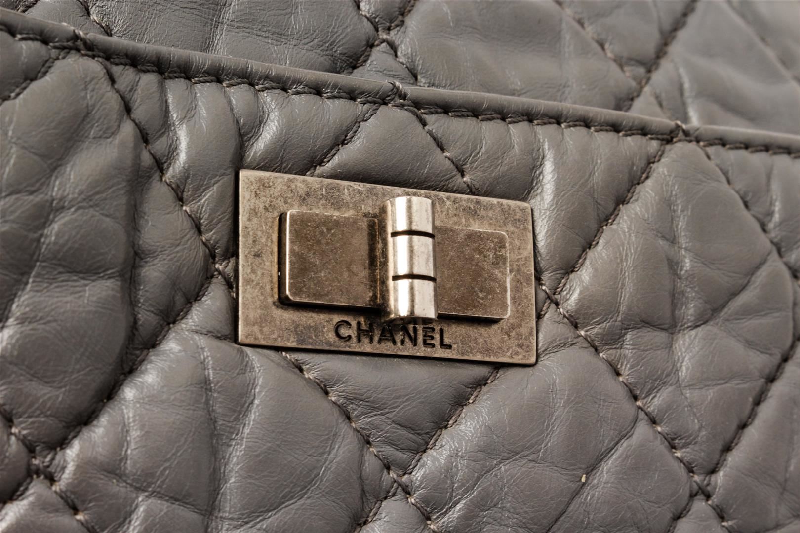 Chanel Grey Leather 2.55 Large Reissue Camera Shoulder Bag. All available information is listed in the description and shown in the photos. Chanel Grey Leather 2.55 Large Reissue Camera Shoulder Bag with silver-tone hardware, chain-link shoulder straps, dual exterior pockets, leather lining & three interior pockets, interlocking cc logo & quilted pattern, zip closure at top. Height: 9.25", Width: 12", Depth: 3.5" / 23.49 x 30.48 x 8.89 CM