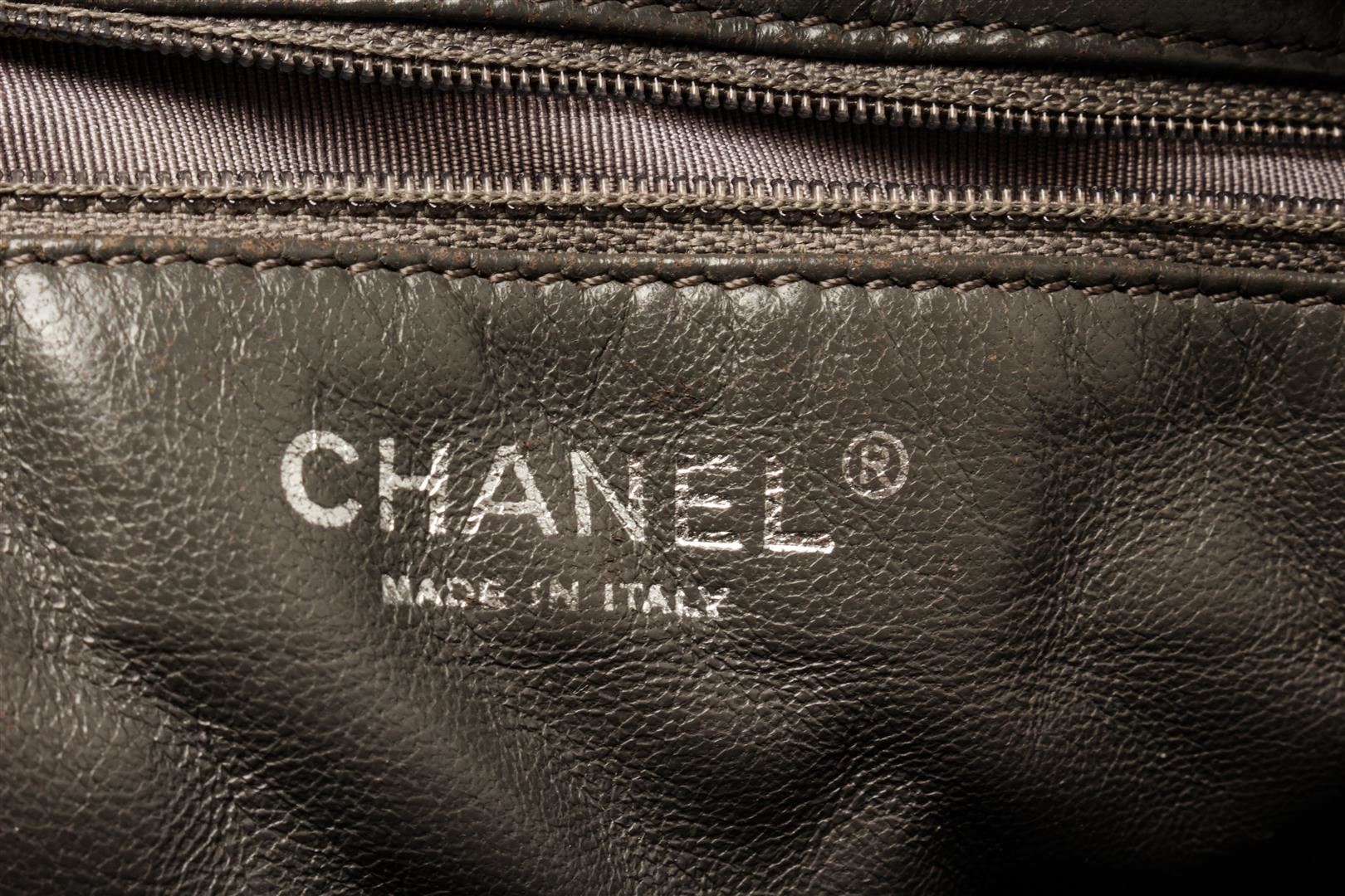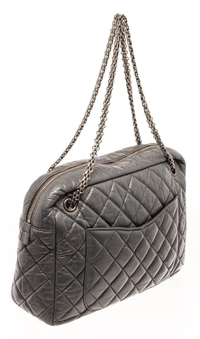 Chanel Grey Leather 2.55 Large Reissue Camera Shoulder Bag. All available information is listed in the description and shown in the photos. Chanel Grey Leather 2.55 Large Reissue Camera Shoulder Bag with silver-tone hardware, chain-link shoulder straps, dual exterior pockets, leather lining & three interior pockets, interlocking cc logo & quilted pattern, zip closure at top. Height: 9.25", Width: 12", Depth: 3.5" / 23.49 x 30.48 x 8.89 CM