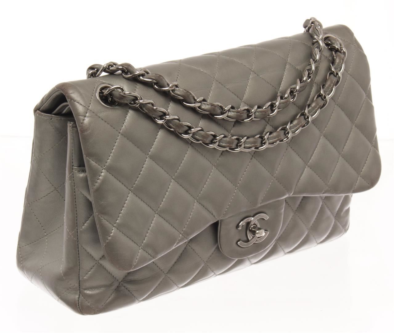 Chanel Grey Leather Large Double Flap Shoulder Bag. All available information is listed in the description and shown in the photos. chanel grey leather large double flap shoulder bag with lambskin leather and has a soft metallic finish, it opens up to 2 compartments, one of which has different side pockets, there is another pocket in the back of the flap bag. Height: 16 cm (6.3 in), Width: 26 cm (10.24 in), Depth: 8 cm (3.15 in)
