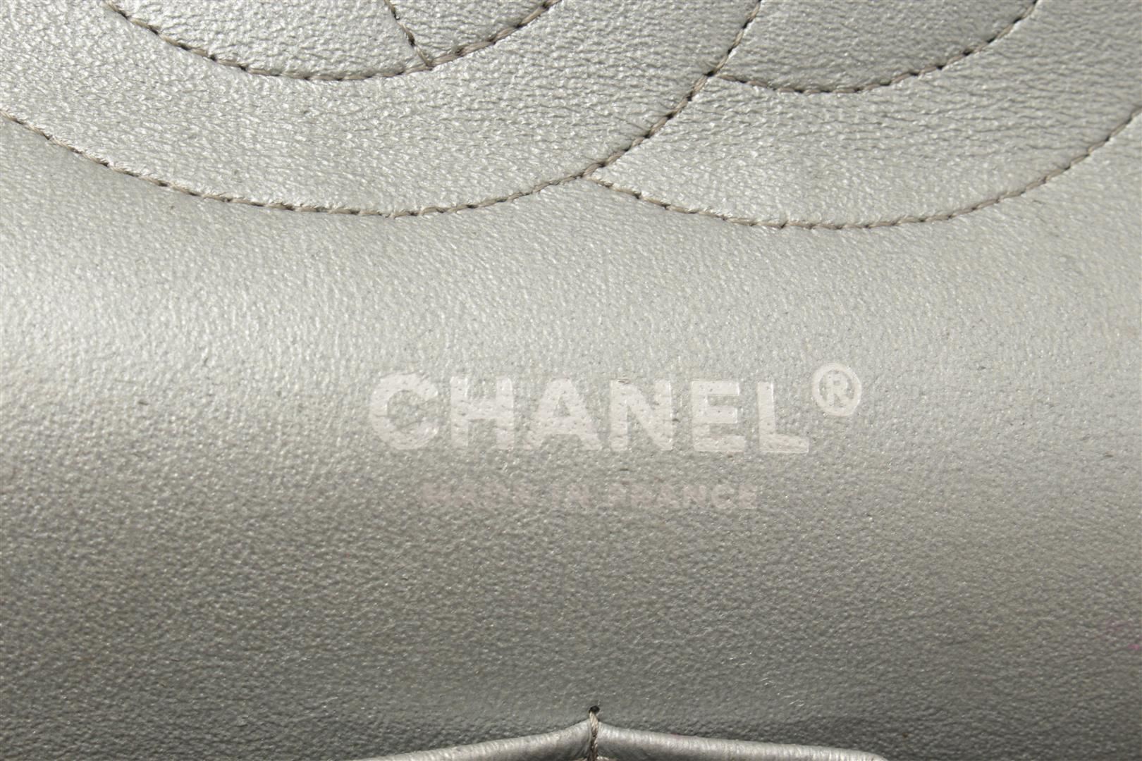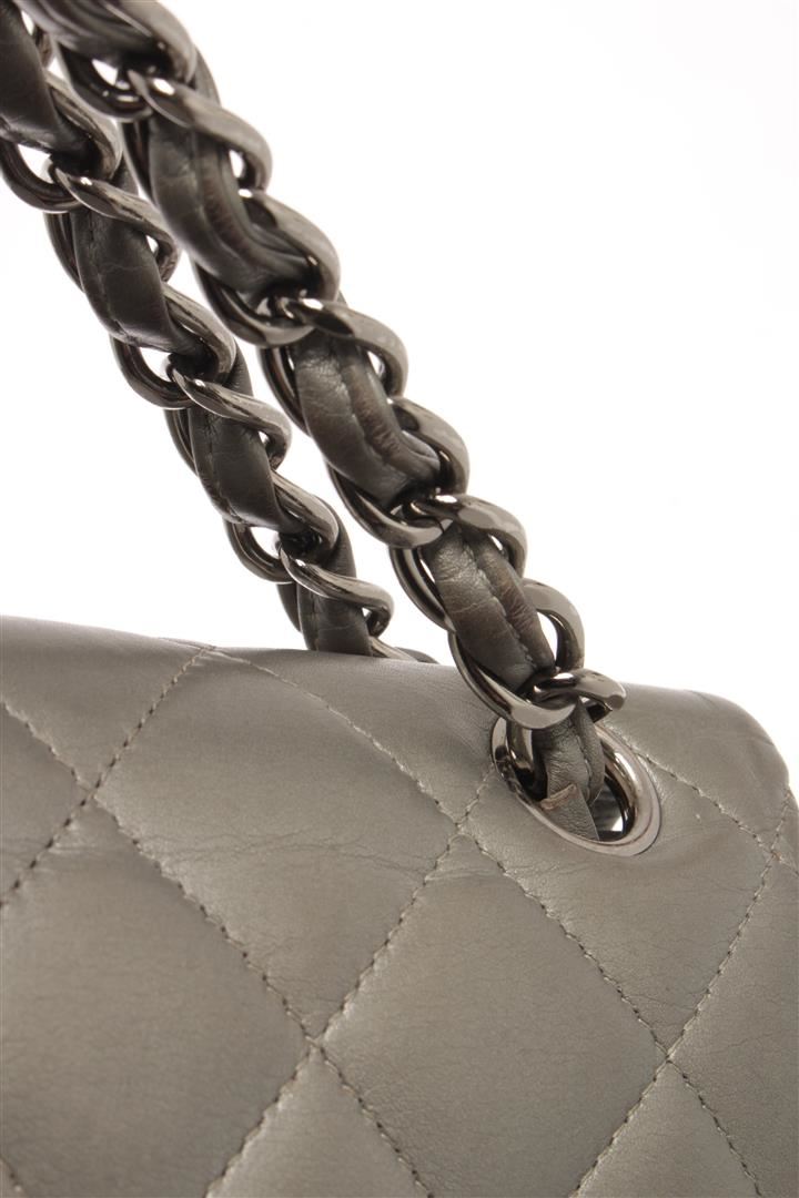 Chanel Grey Leather Large Double Flap Shoulder Bag. All available information is listed in the description and shown in the photos. chanel grey leather large double flap shoulder bag with lambskin leather and has a soft metallic finish, it opens up to 2 compartments, one of which has different side pockets, there is another pocket in the back of the flap bag. Height: 16 cm (6.3 in), Width: 26 cm (10.24 in), Depth: 8 cm (3.15 in)