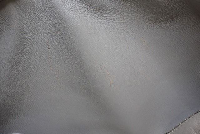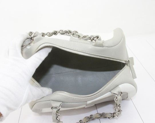 One Chanel Grey White Lambskin Bicolor Leather CC Bowling Bag. Item is sold AS-IS. All available information is listed in the description and shown in the photo. Crafted in grey and white leather, Chanel CC Bicolor bowling bag features silver-tone hardware detailing. The bag exhibits an interlocking CC logo at the front, twin entwined chain and leather straps, and a zip closure with leather pull. The leather-lined interior houses a zip pocket. Height: 7.88 in. (20 cm) Width: 6.3 in. (16 cm) Length: 10.24 in. (26 cm)