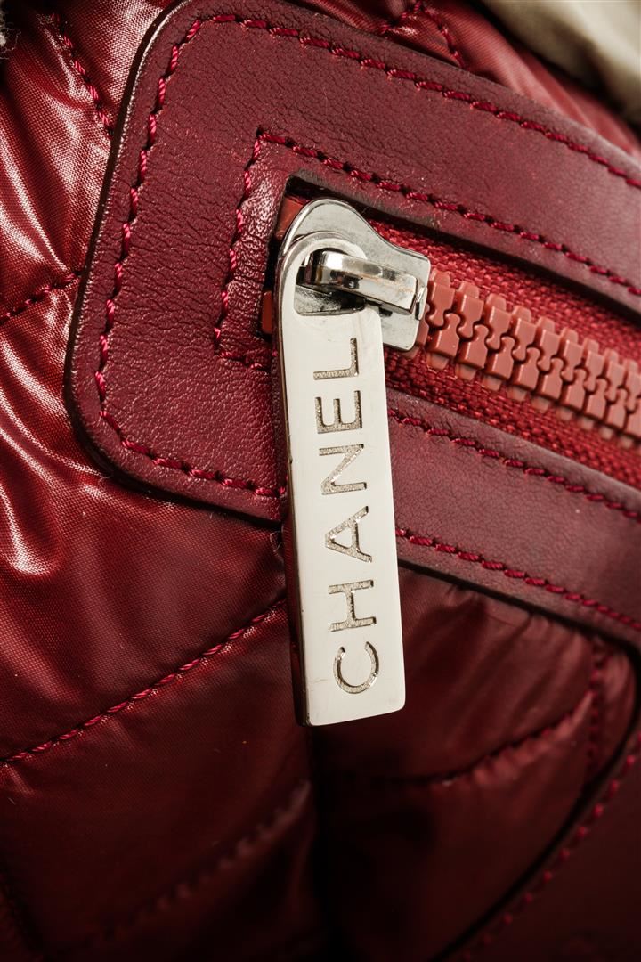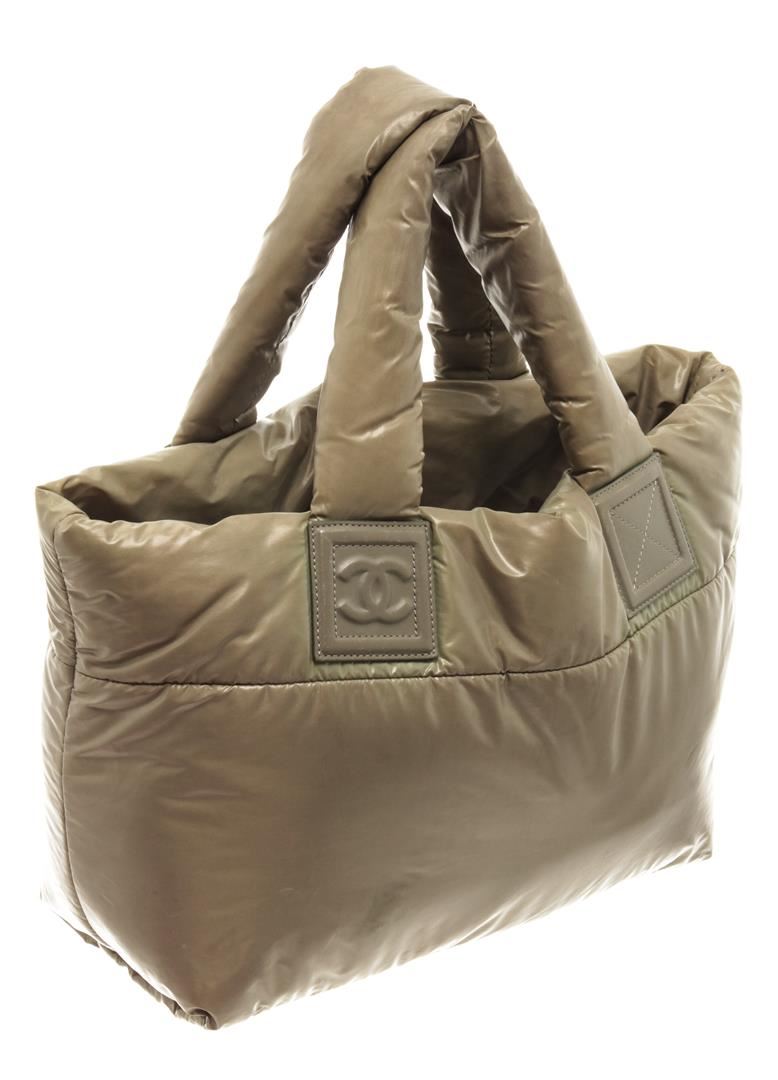 One Chanel Khaki Nylon Coco Cocoon Tote Bag. Item is sold AS-IS. All available information is listed in the description and shown in the photo. Chanel khaki nylon Coco Cocoon tote bag with hook closure, silver-tone hardware, red nylon lining, one interior zip pocket, khaki leather on the base of the straps and red leather around the interior pocket zipper, and top handles. Height: 9.5" Width: 17" Depth: 5", Handle Drop: 6" / 24.13 x 43.18 x 12.7 Cm