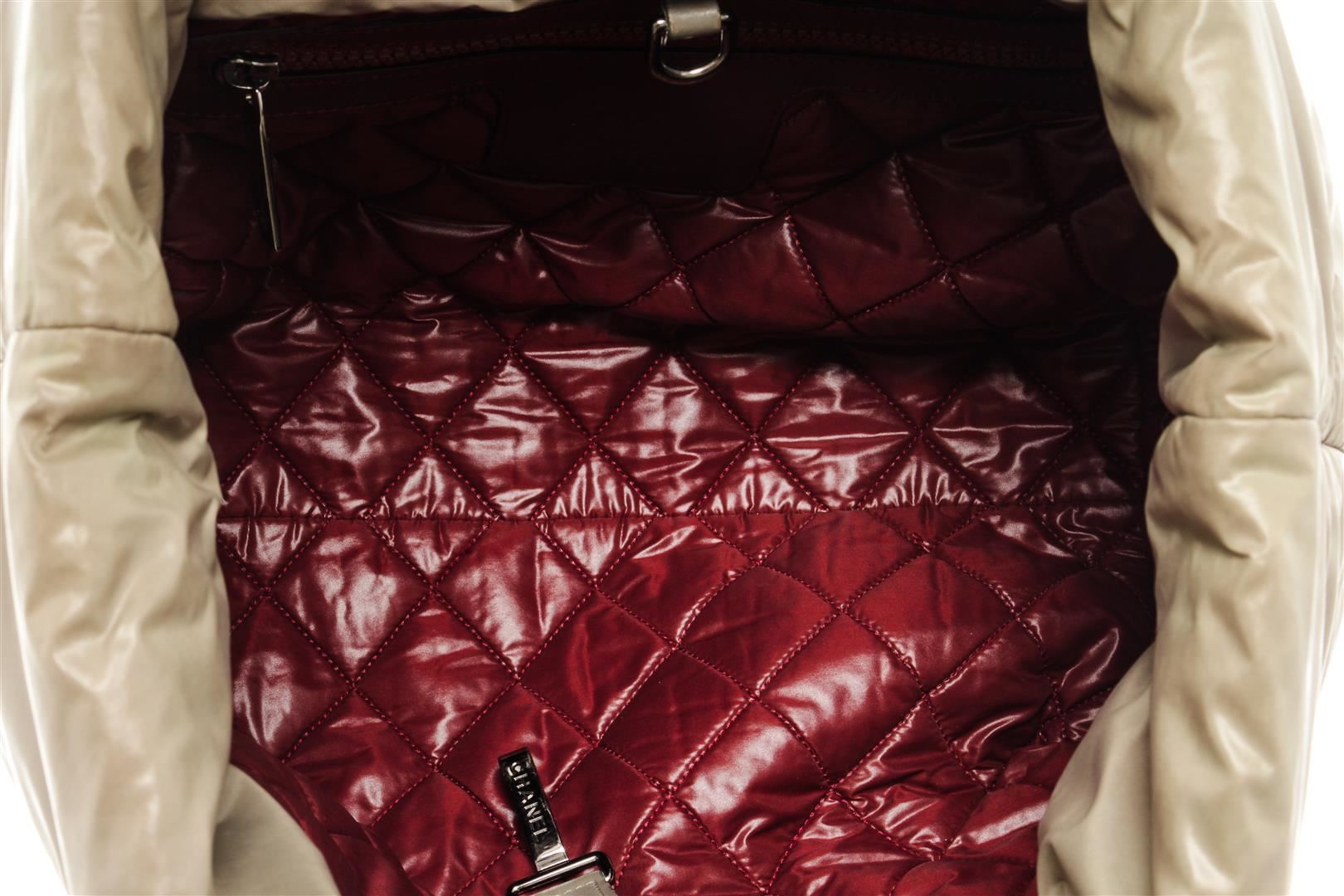 One Chanel Khaki Nylon Coco Cocoon Tote Bag. Item is sold AS-IS. All available information is listed in the description and shown in the photo. Chanel khaki nylon Coco Cocoon tote bag with hook closure, silver-tone hardware, red nylon lining, one interior zip pocket, khaki leather on the base of the straps and red leather around the interior pocket zipper, and top handles. Height: 9.5" Width: 17" Depth: 5", Handle Drop: 6" / 24.13 x 43.18 x 12.7 Cm