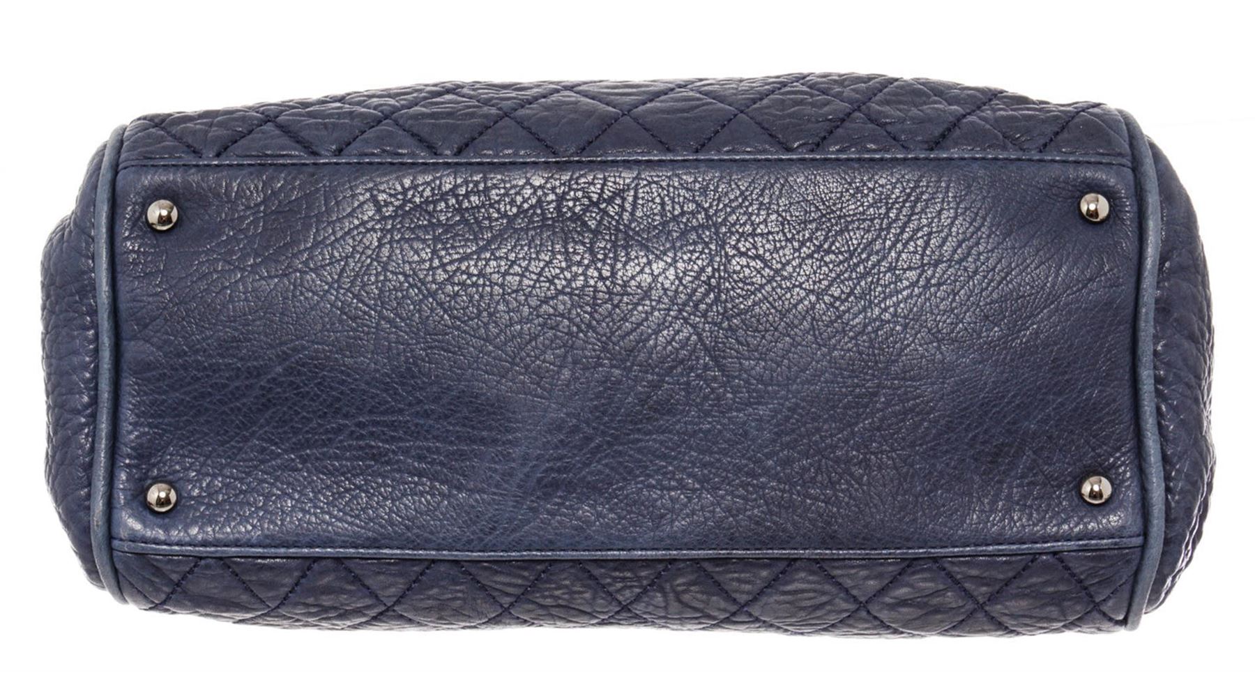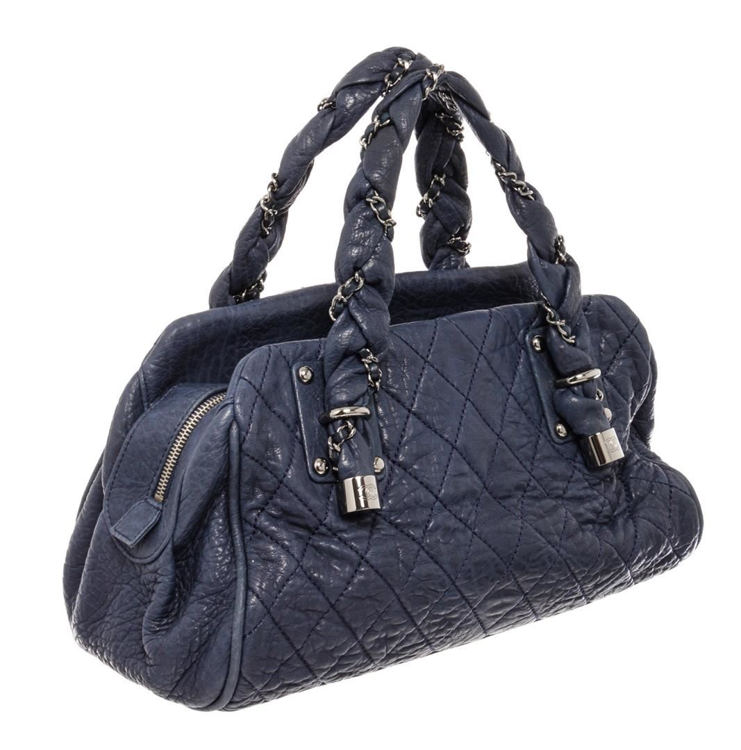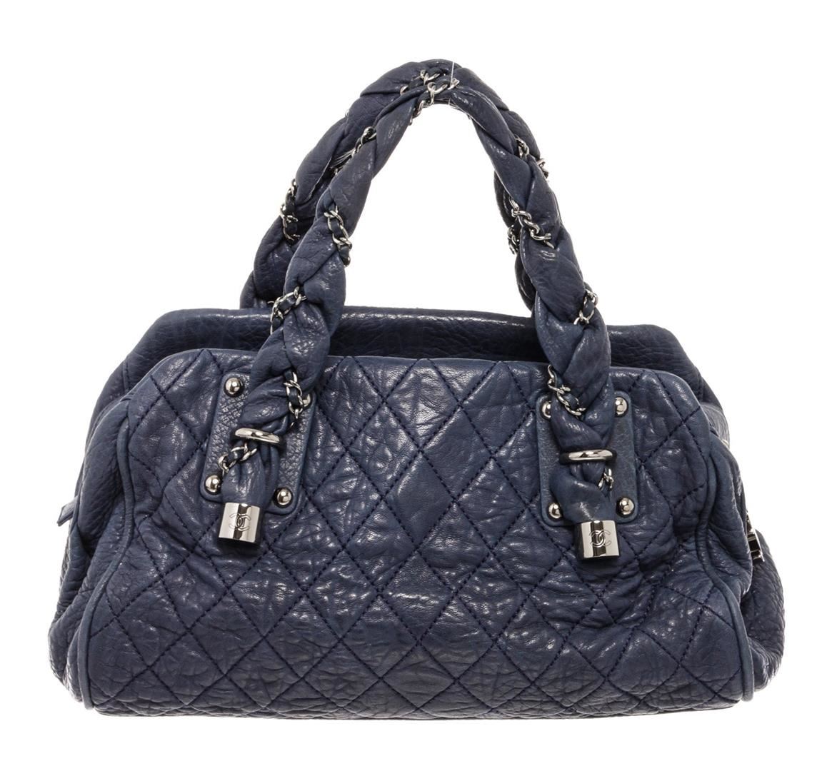 Chanel Lady Braid Bowler Bag Shoulder Bag. Brand: Chanel, Style: Lady Braid Bowler Bag, Type: Shoulder Bag, Exterior color: Blue, Exterior material: Calfskin, Interior color: Silver, Interior material: Satin, Length: 13, Width: 6, Height: 7. Item is sold