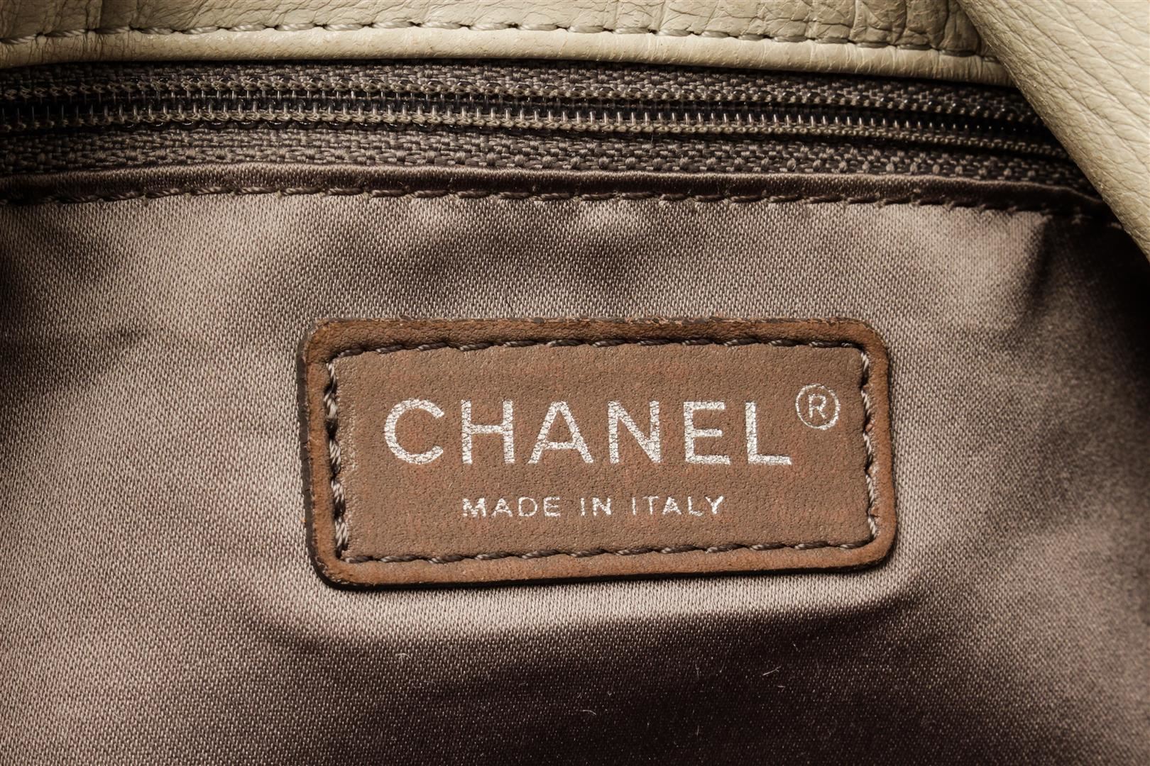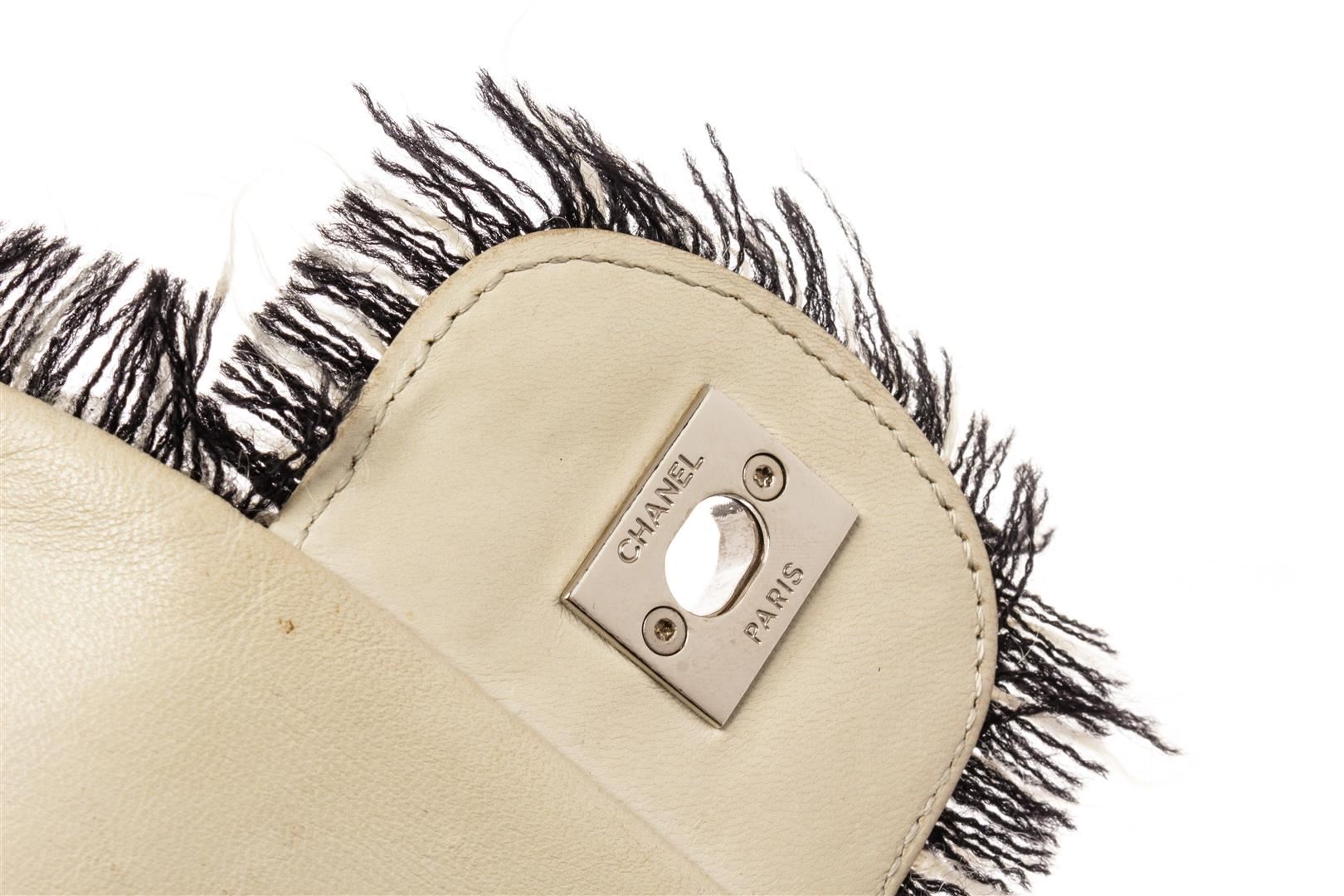 Chanel Light Grey Lambskin Leather Fringe Flap Shoulder Bag. All available information is listed in the description and shown in the photos. Chanel Light Grey Lambskin Leather and Black/White Fringe Flap Shoulder Bag with opening secured with double flap covers and CC turnlock, palladium chain and leather entwined strap, zip pocket on the inside, textile lining, silvertone hardware. Condition Details: Some wear/scuffing on surface, bottom, and bottom corners. Length: 9.84" Width: 1.96" Height: 5.11"/ Length - 25cm, Width - 5cm, Height - 13cm