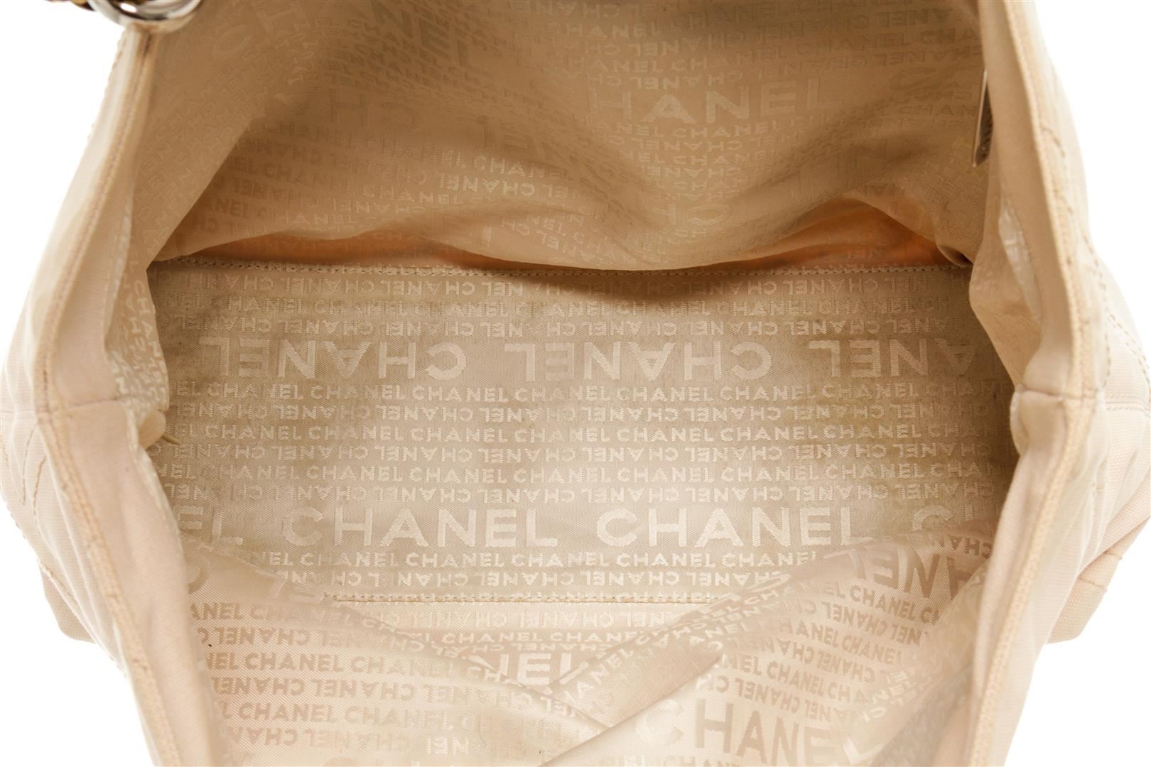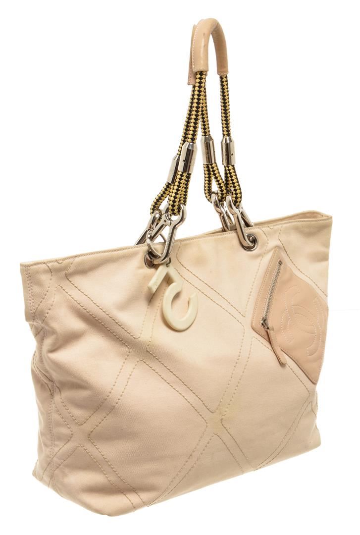Chanel Light Pink Beige Leather No.5 Coco Mark Rope Tote Bag. All available information is listed in the description and shown in the photos. Chanel Light Pink Beige Canvas No.5 Coco Mark Rope Tote Bag with silver-tone hardware, Chanel no.5 iconic logo on the strap charm, front zipped pocket, Chanel scripted logo fabric lining, leather & rope shoulder strap, and an open closure at the top. .