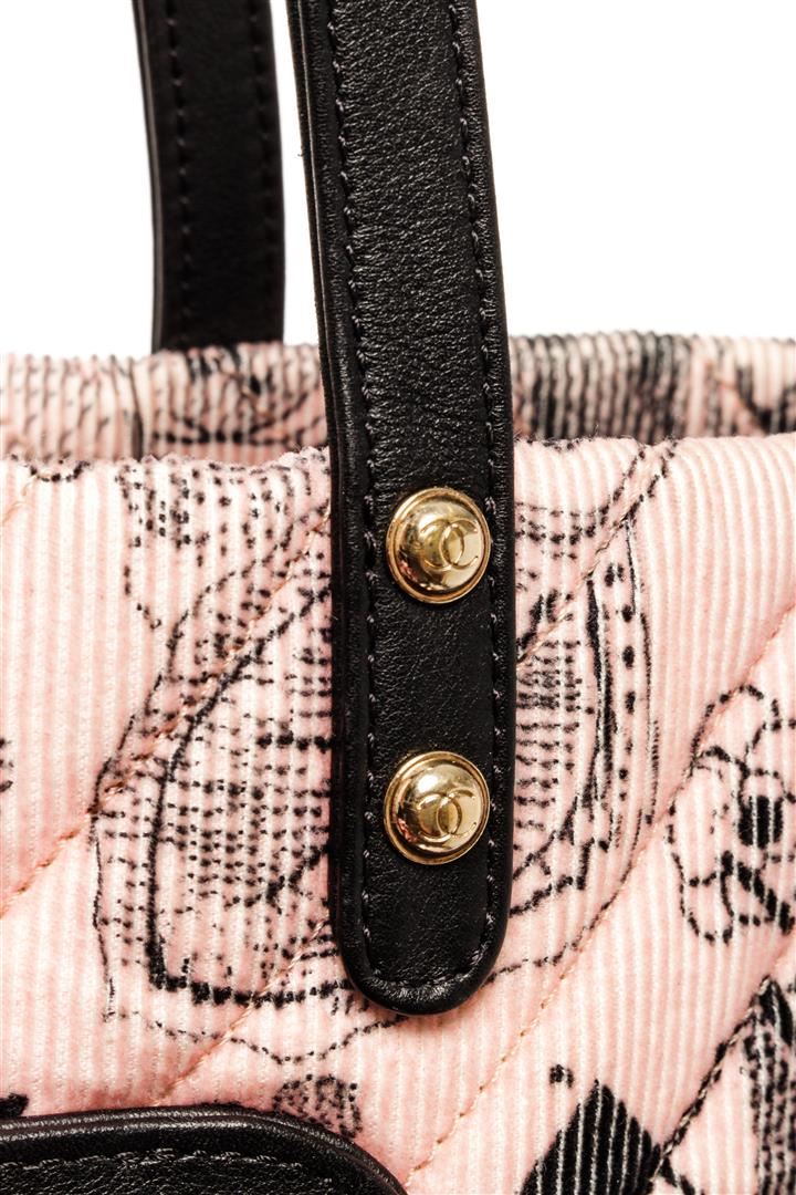One Chanel Light Pink Printed Corduroy with Silk Scarf Tote Bag. Item is sold AS-IS. All available information is listed in the description and shown in the photo. Chanel Light Pink Printed Corduroy with Silk Scarf Tote Bag with gold-tone hardware, black leather trims, black canvas lining, dual leather flat top handles, and zip closure at the top. .