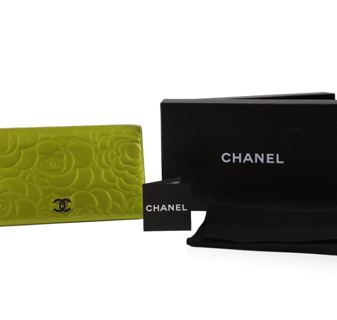 One Chanel lime green patent leather wallet measuring approximately 7.25 by 4.25 inches. The wallet is in good condition with multiple slots for credit cards, bills, and a zipper coin purse for change. Comes with a Chanel box.