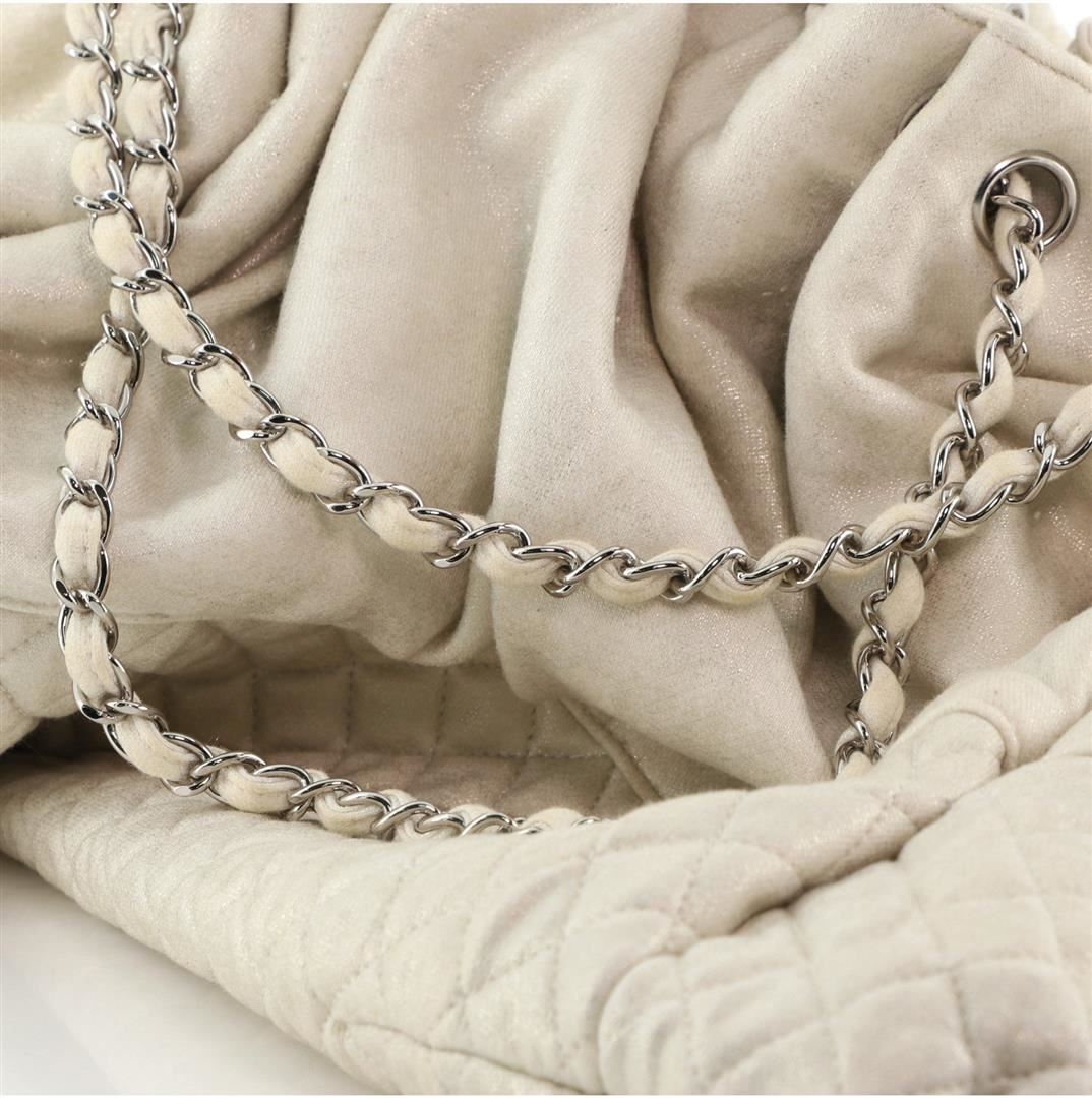 One Chanel Melrose Cabas Tote Jersey Large Neutral. Item is sold AS-IS. All available information is listed in the description and shown in the photo. Chanel Melrose Cabas Tote Jersey Large Beige Jersey Condition Details: Moderate discoloration and stains on exterior and handles, scratches on hardware. Height 13", Width 25", Depth 2.5", Strap Drop None