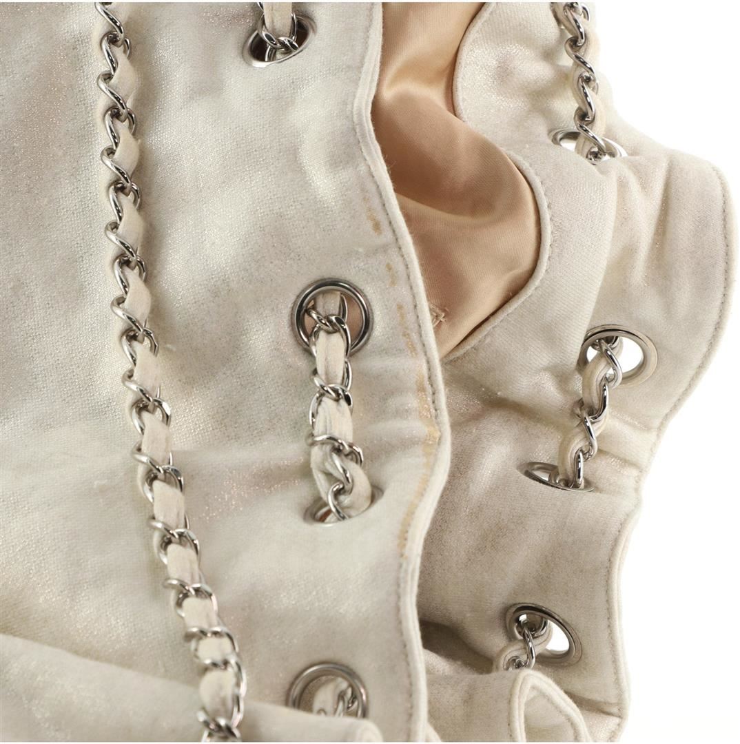 One Chanel Melrose Cabas Tote Jersey Large Neutral. Item is sold AS-IS. All available information is listed in the description and shown in the photo. Chanel Melrose Cabas Tote Jersey Large Beige Jersey Condition Details: Moderate discoloration and stains on exterior and handles, scratches on hardware. Height 13", Width 25", Depth 2.5", Strap Drop None