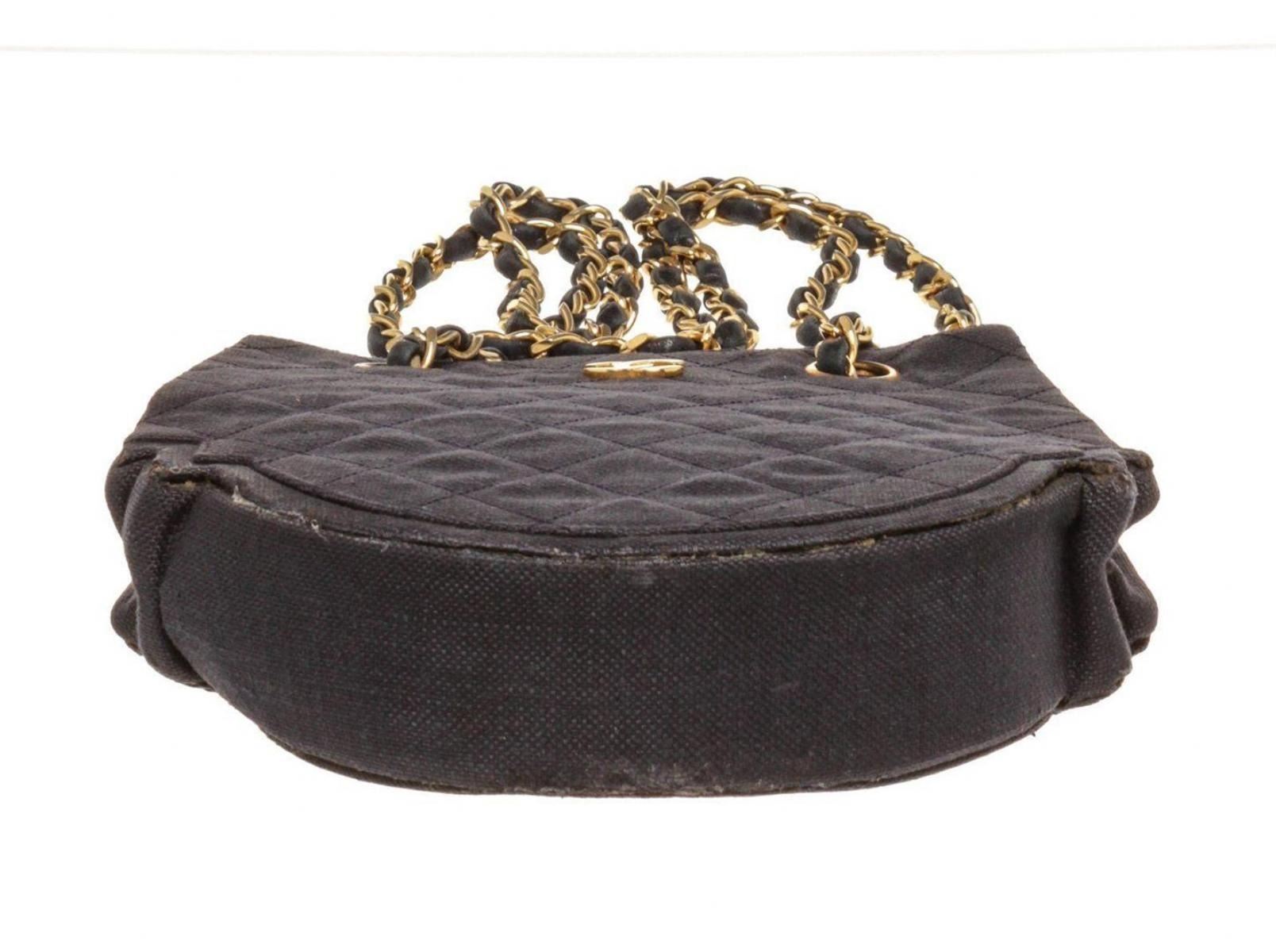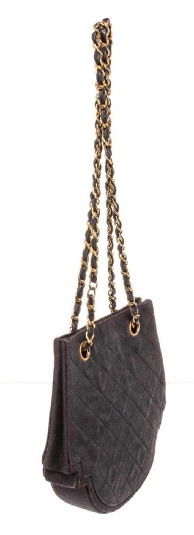 Chanel Navy Blue Denim Vintage Chain Shoulder Handbag with Material Leather, gold-tone hardware, one interior slip pocket, Leather shoulder strap and Snap closure.