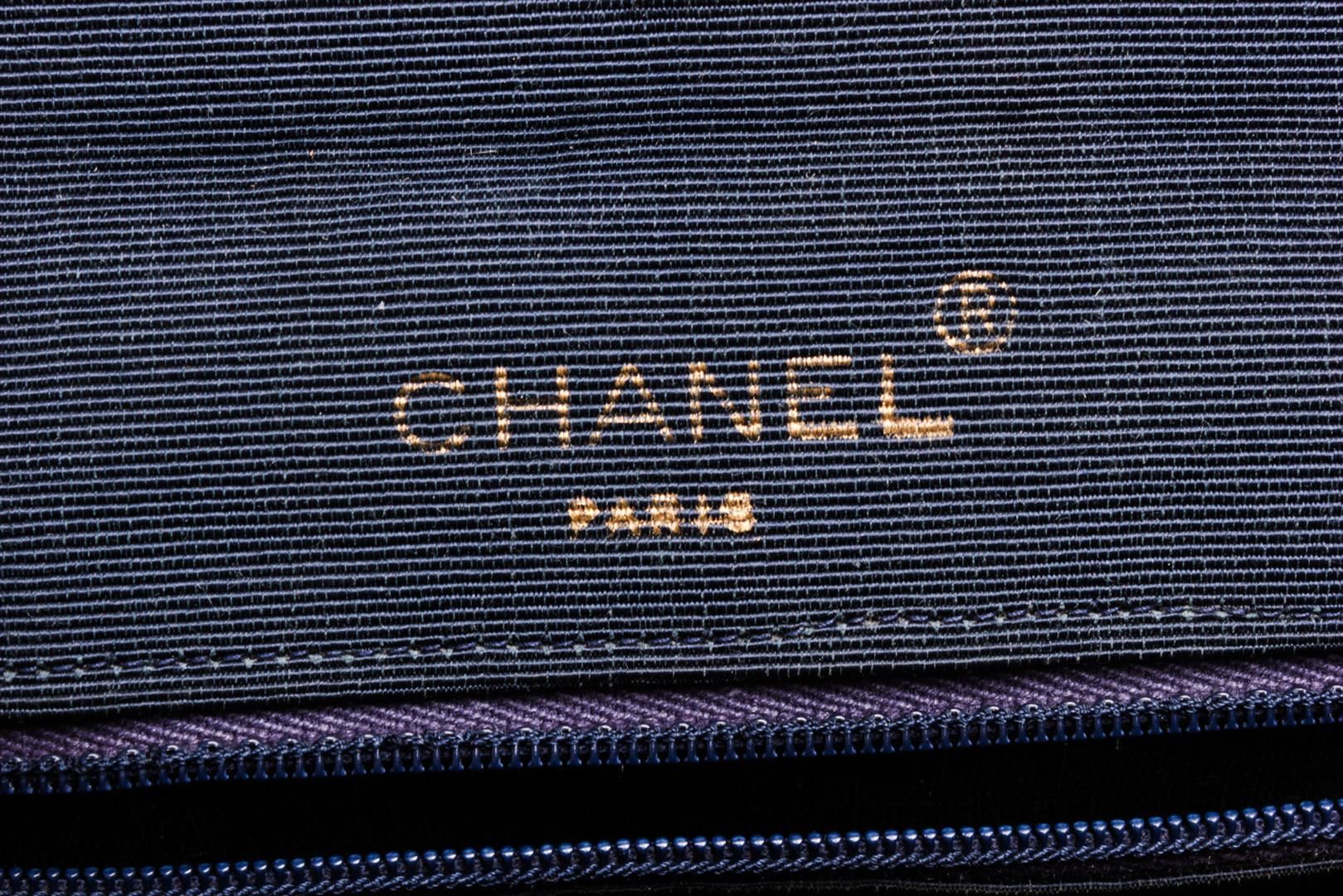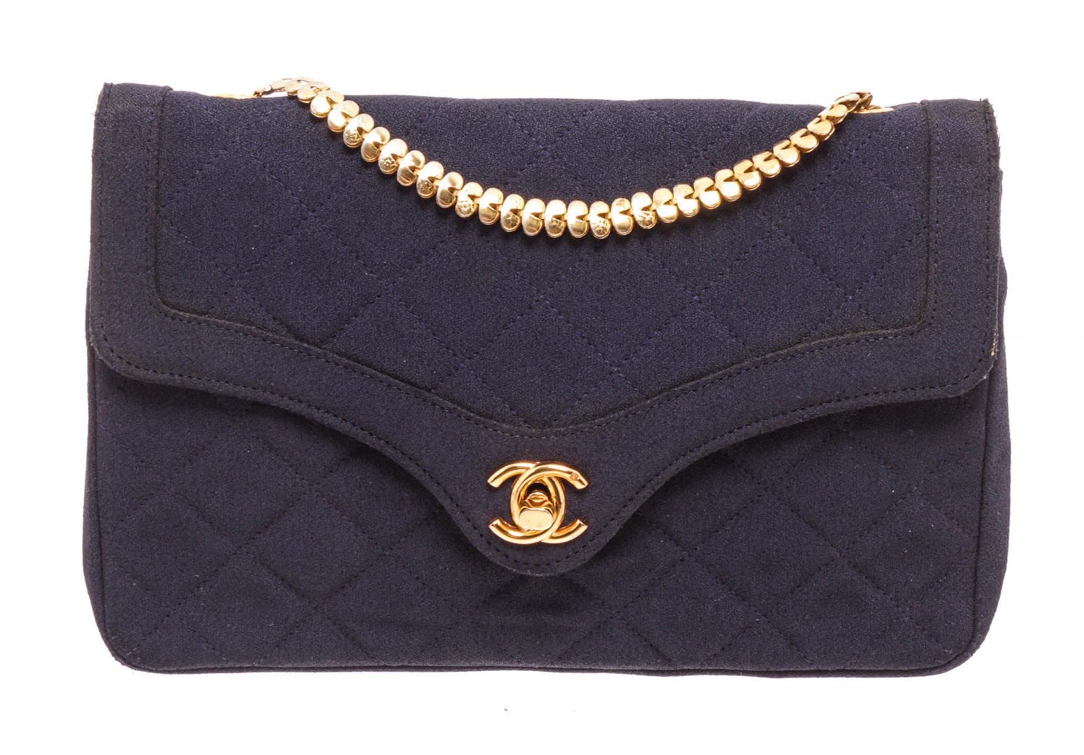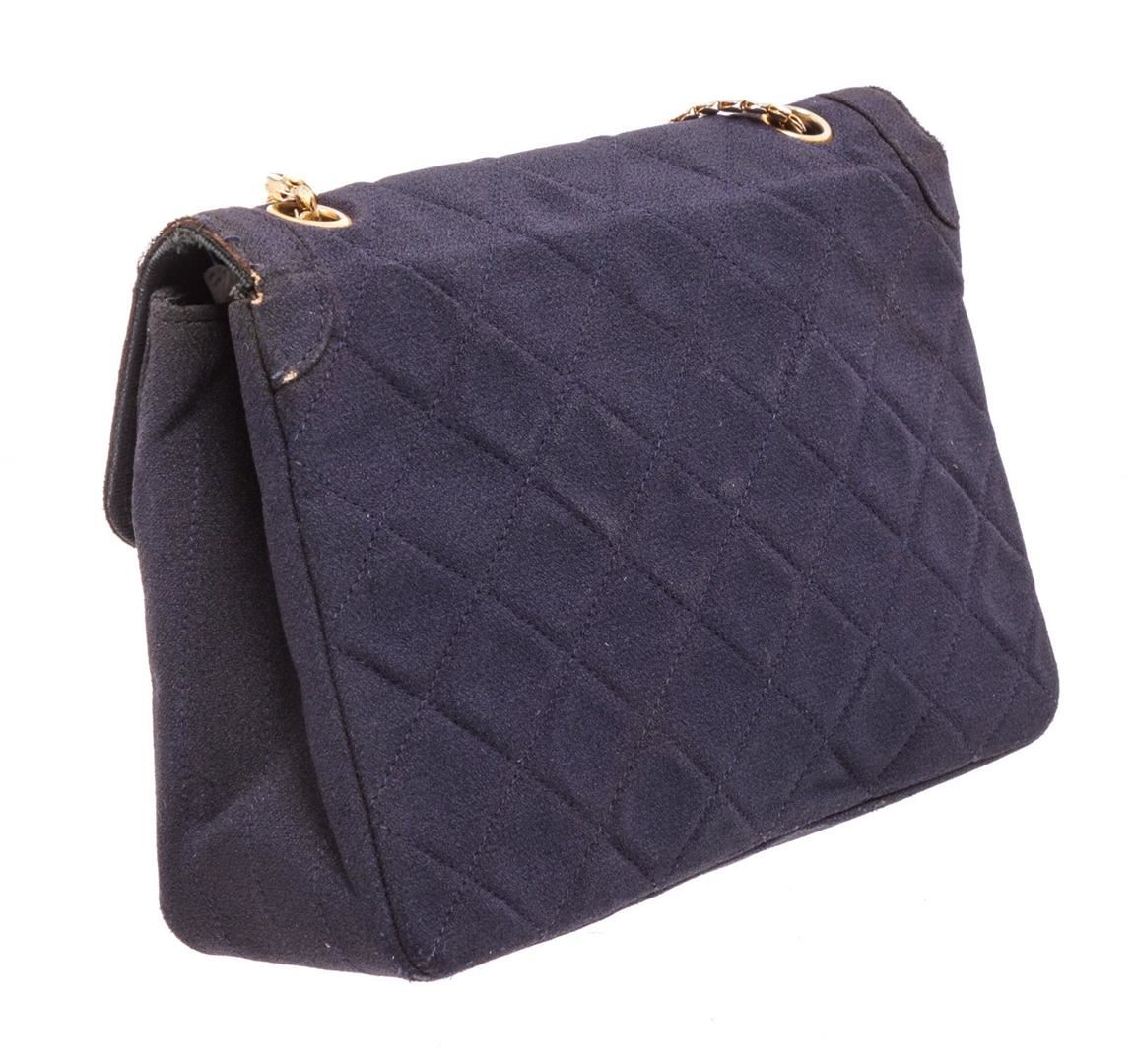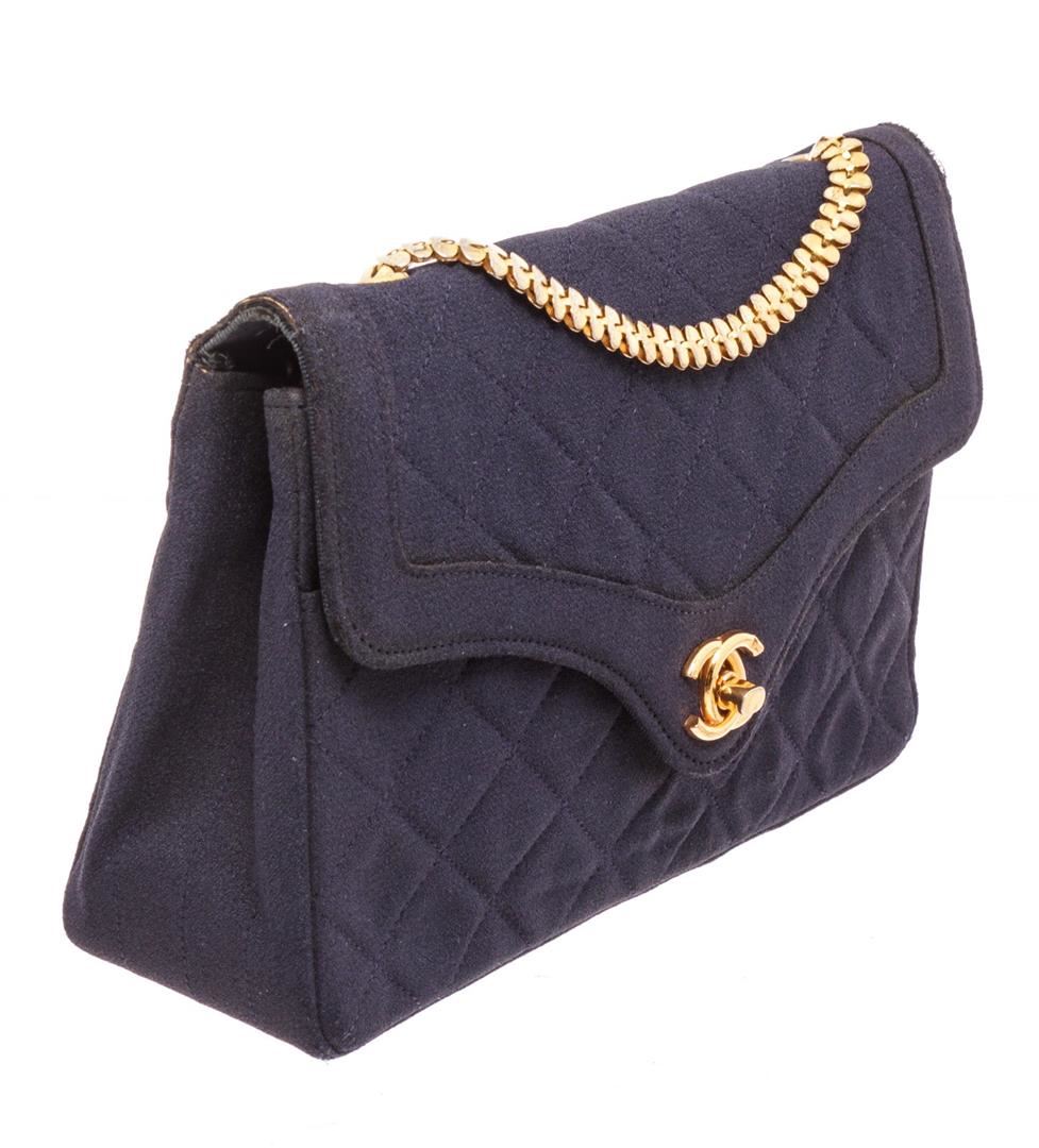 Chanel Navy Blue Fabric Envelope Flap Crossbody Bag. All available information is listed in the description and shown in the photos. Chanel Navy Blue Fabric Envelope Flap Crossbody Bag with gold-tone hardware, single chain-link and leather shoulder strap, blue fabric lining, single slit pocket at interior wall, CC turn-lock closure at front flap. 28338Measurements: Length: 8 in / 20 cm Width: 1.25 in / 3 cm 5.25 in / 13 cm Condition: Pre-Owned Good overall, please see photographs for detail.