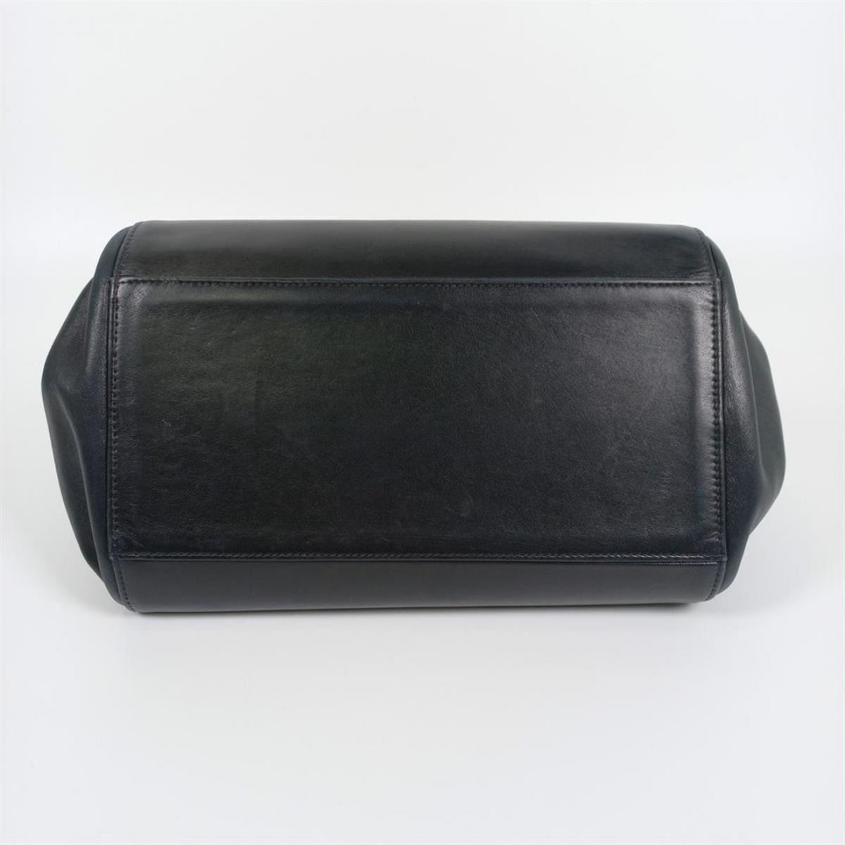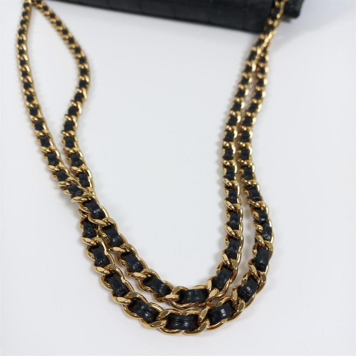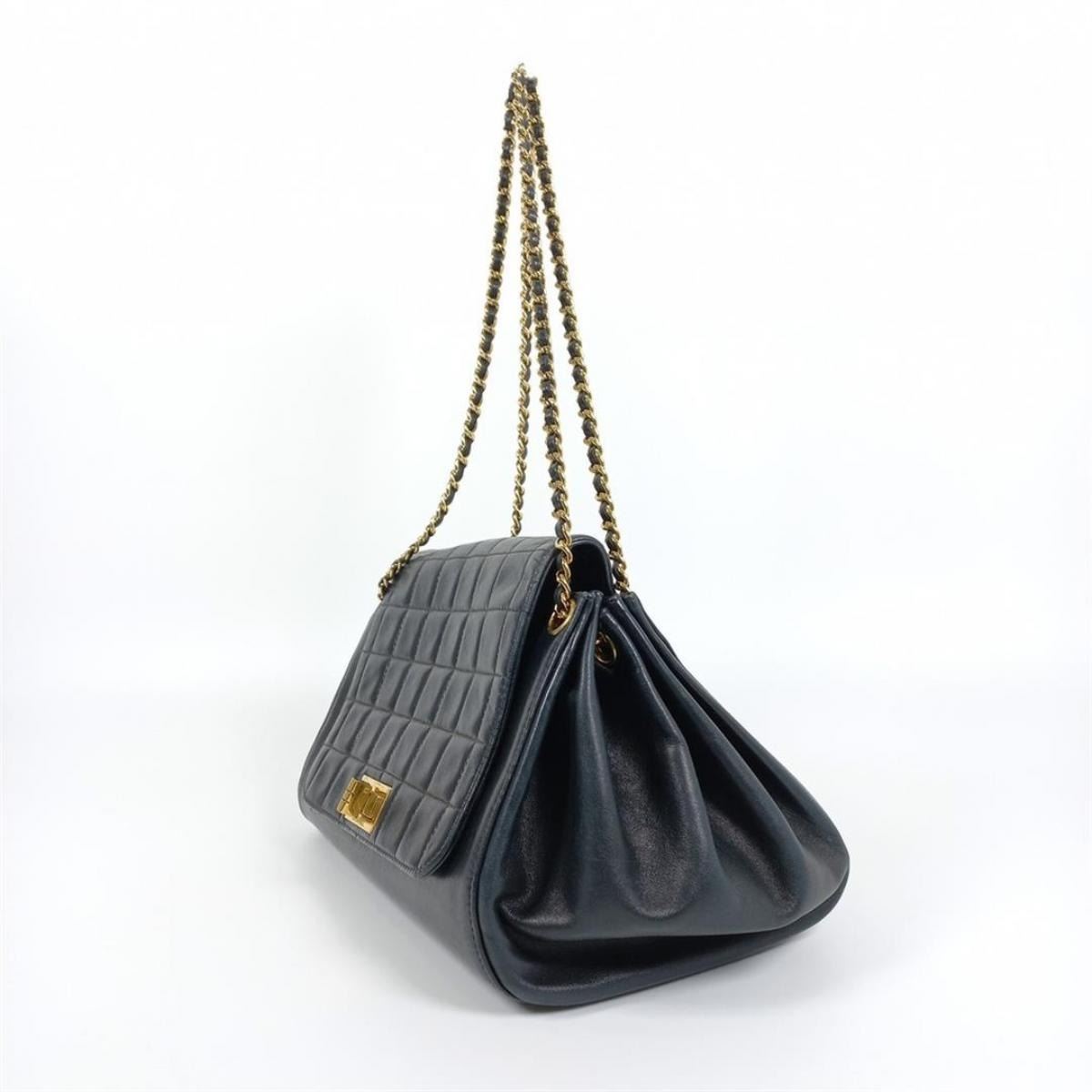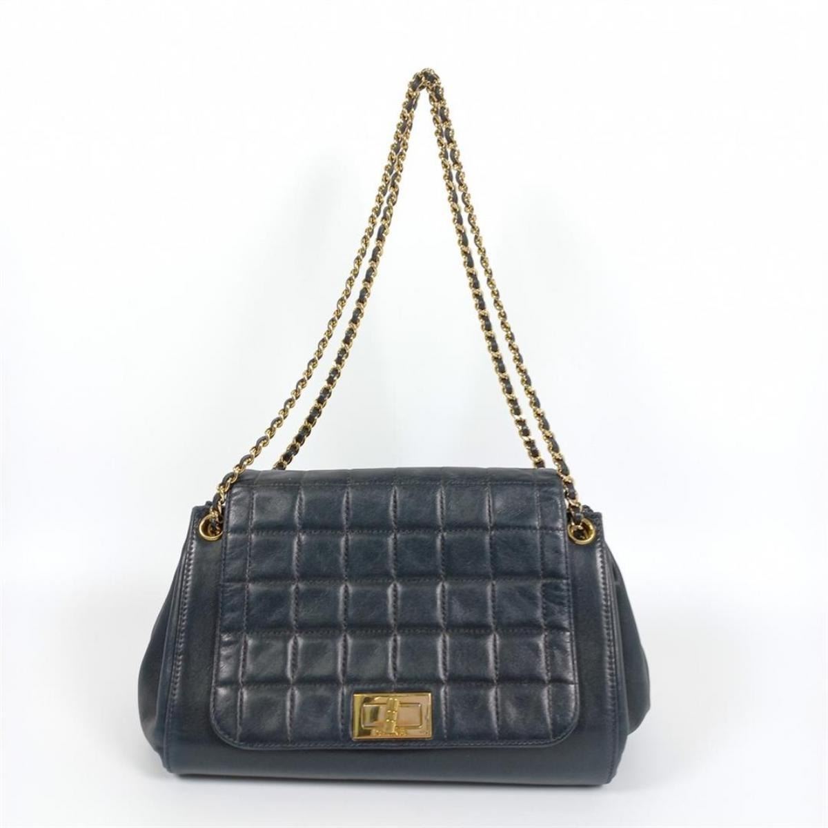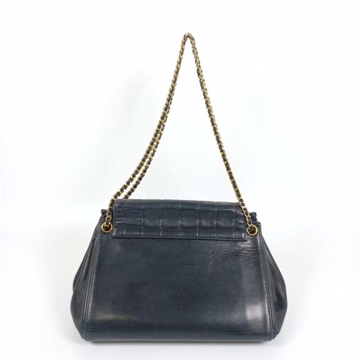 Navy blue leather Chanel Chocolate Bar Accordion Flap bag with gold-tone hardware, convertible leather and chain-link shoulder strap, tonal quilted panel at front flap, navy blue leather lining, single zip pocket at interior wall and Mademoiselle turn-loc