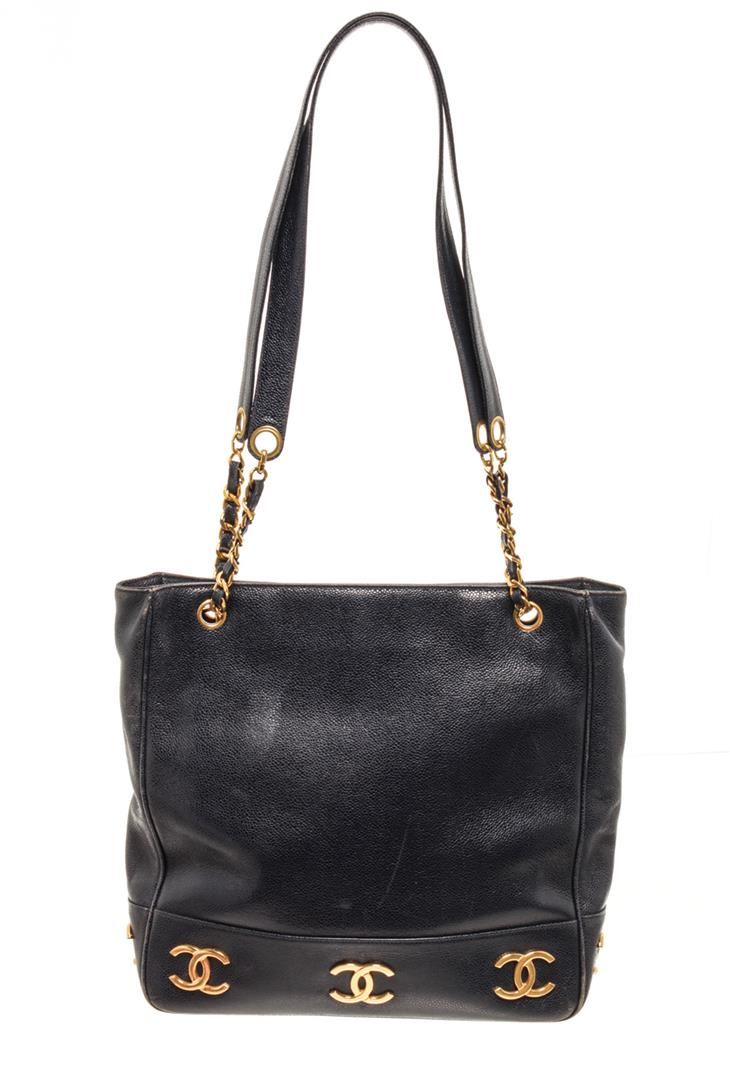 One Chanel Navy Caviar Leather Triple CC Shoulder Bag. Item is sold AS-IS. All available information is listed in the description and shown in the photo. Chanel Navy Caviar Leather Triple CC Shoulder Bag with caviar leather, this shoulder bag features tall leather shoulder straps with woven-in chain details, iconic gold CC logo hardware at its base, front pocket, and gold-tone hardware accents. Its top snap closure opens to a black leather interior with side zip pockets Height: 11 in (27.94 cm), Width: 12 in (30.48 cm), Depth: 3.5 in (8.89 cm)