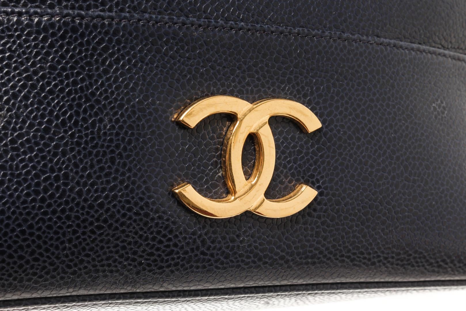 One Chanel Navy Caviar Leather Triple CC Shoulder Bag. Item is sold AS-IS. All available information is listed in the description and shown in the photo. Chanel Navy Caviar Leather Triple CC Shoulder Bag with caviar leather, this shoulder bag features tall leather shoulder straps with woven-in chain details, iconic gold CC logo hardware at its base, front pocket, and gold-tone hardware accents. Its top snap closure opens to a black leather interior with side zip pockets Height: 11 in (27.94 cm), Width: 12 in (30.48 cm), Depth: 3.5 in (8.89 cm)