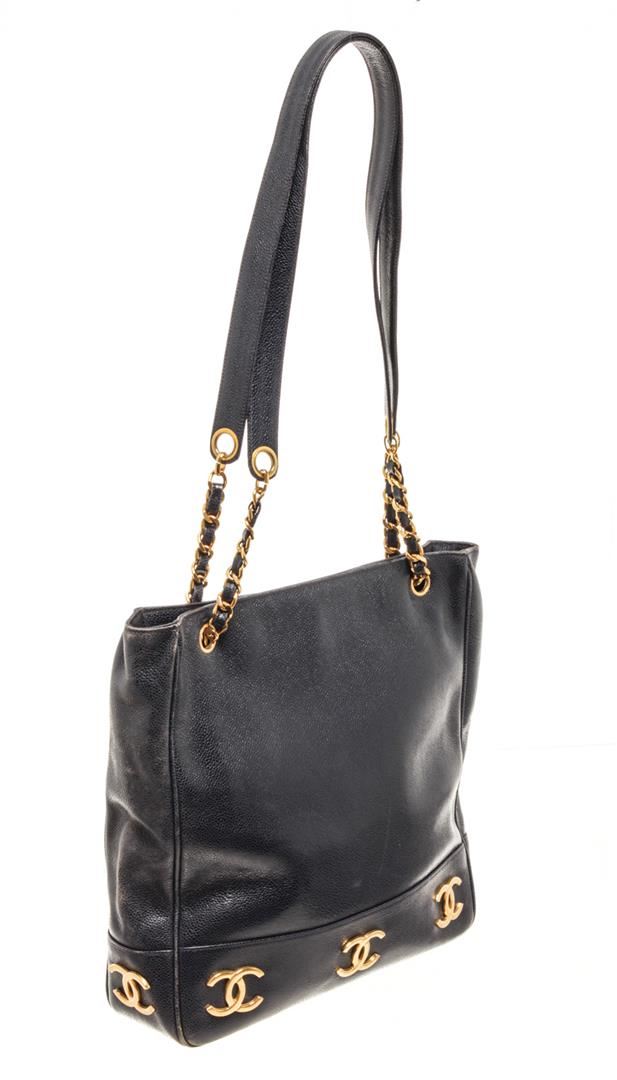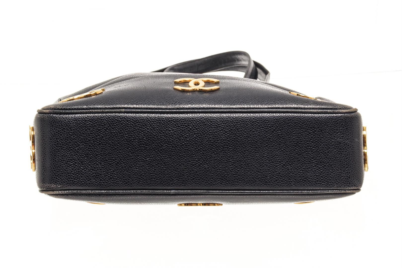 One Chanel Navy Caviar Leather Triple CC Shoulder Bag. Item is sold AS-IS. All available information is listed in the description and shown in the photo. Chanel Navy Caviar Leather Triple CC Shoulder Bag with caviar leather, this shoulder bag features tall leather shoulder straps with woven-in chain details, iconic gold CC logo hardware at its base, front pocket, and gold-tone hardware accents. Its top snap closure opens to a black leather interior with side zip pockets Height: 11 in (27.94 cm), Width: 12 in (30.48 cm), Depth: 3.5 in (8.89 cm)