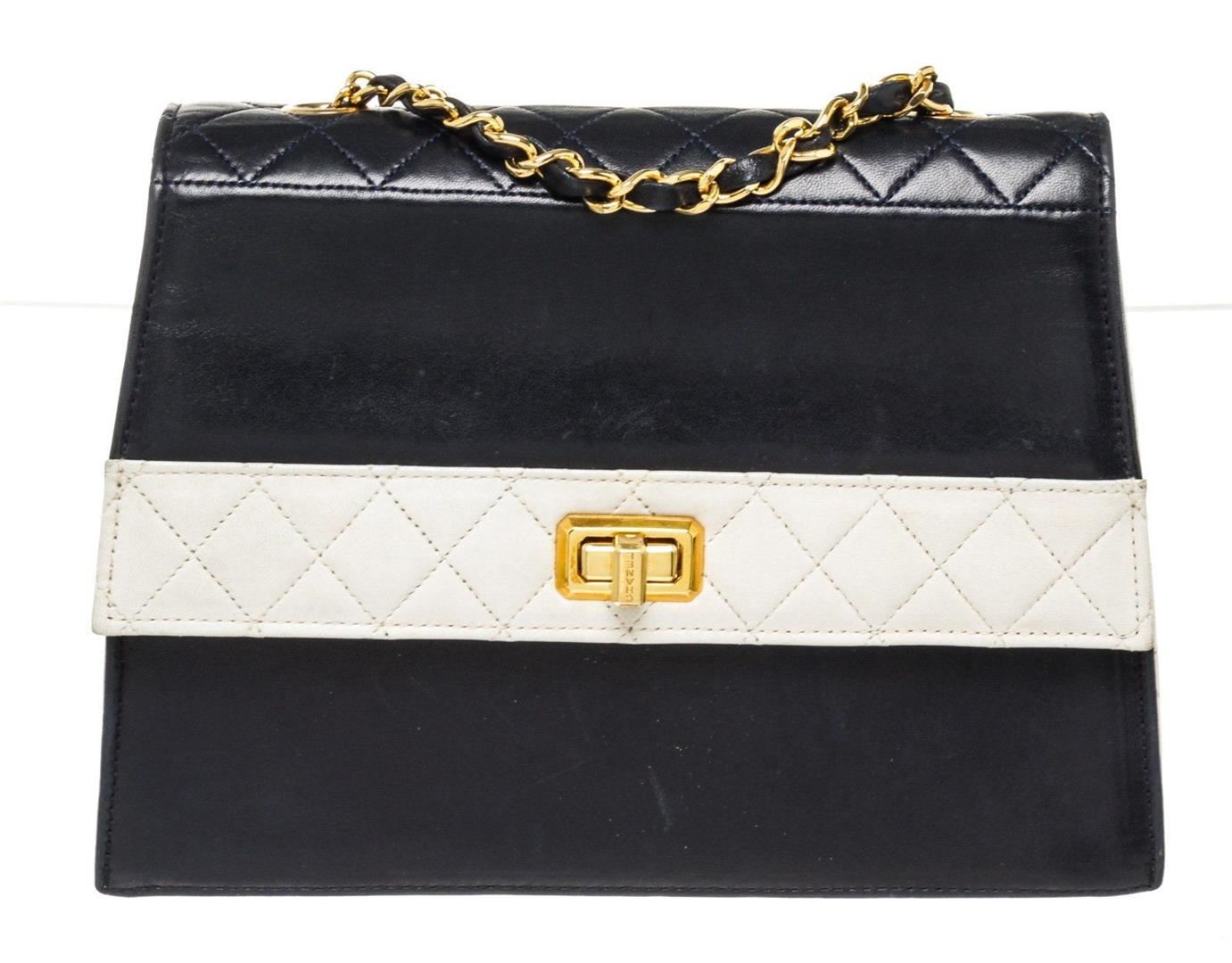 Chanel Navy White Lambskin Two Tone Flap Shoulder Bag with leather, gold-tone hardware, trim leather, interior slip pocket, chain shoulder strap and snap closure. Measurements: 9 in / 23 cm 3 in / 8 cm 8 in / 20 cm Condition: Pre-Owned Good