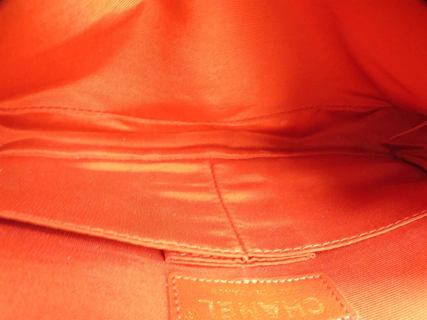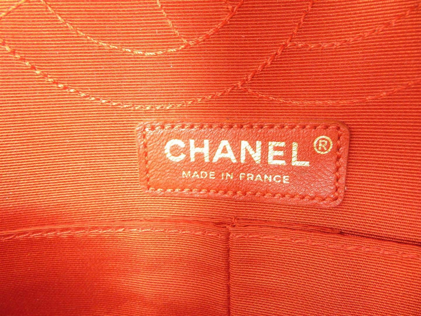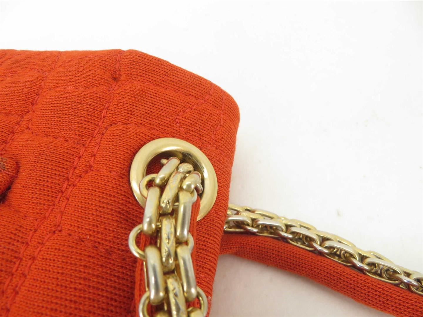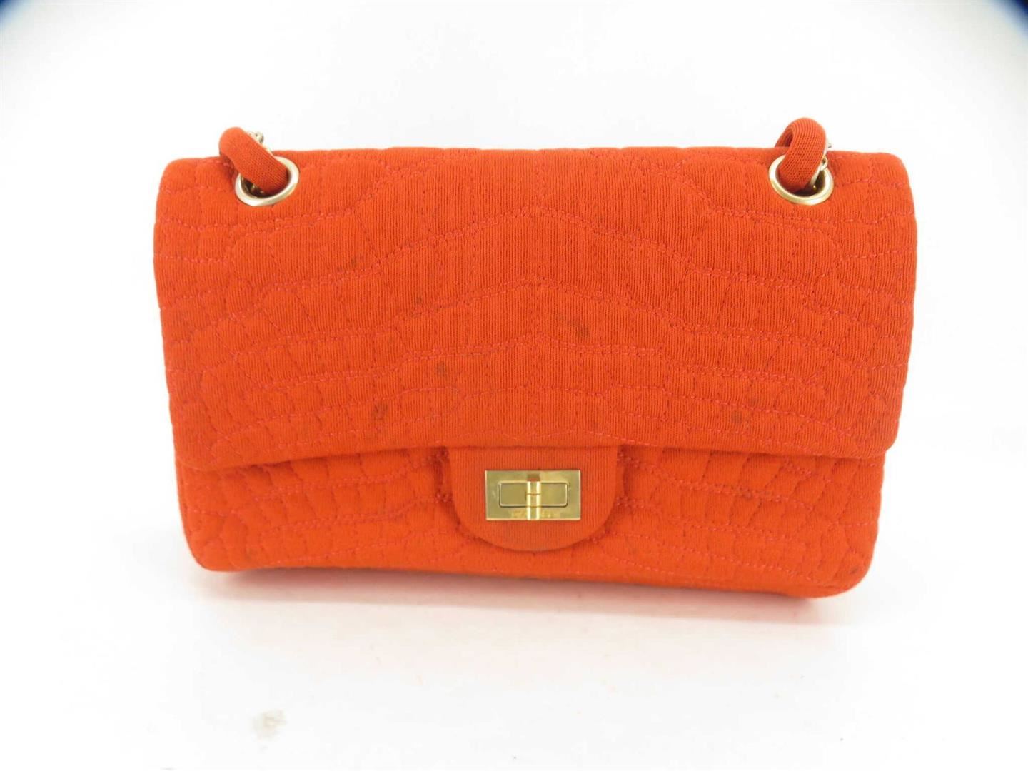 Orange coral quilted Chanel Jersey Reissue double flap bag with gold-tone hardware, single convertible chain-link and jersey shoulder strap, single patch pocket at exterior back, single zip pocket at flap underside, tonal grosgrain lining, three compartme