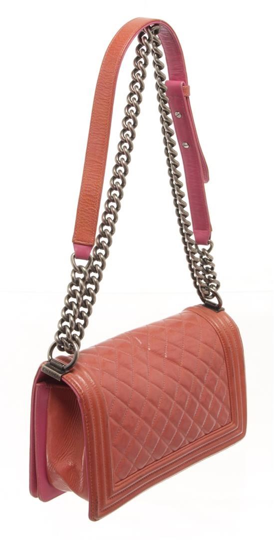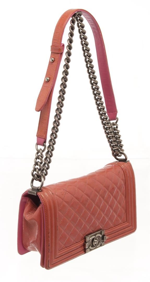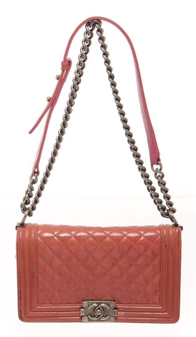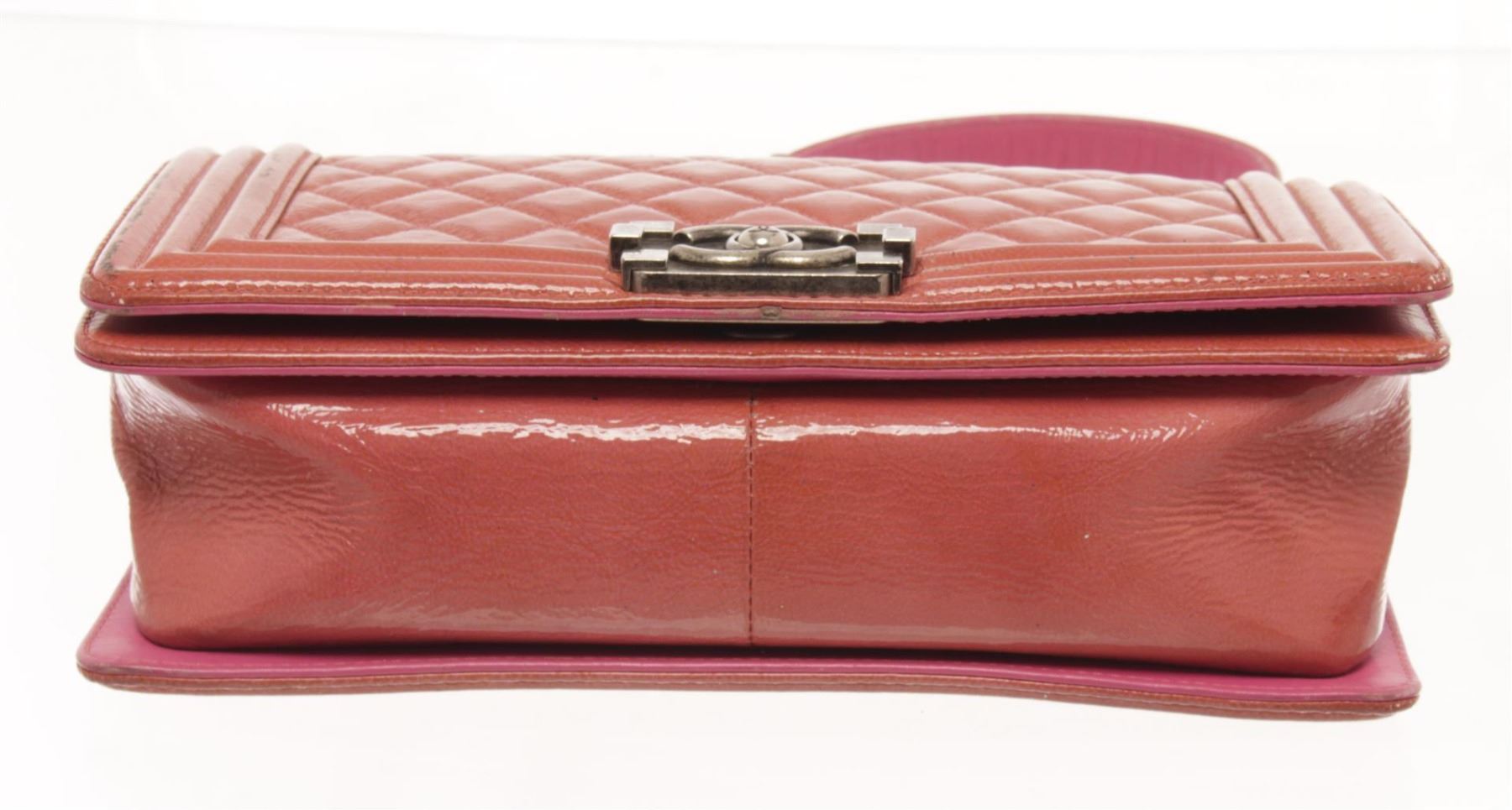 One Chanel Peach Lambskin Large Boy Shoulder Bag. Item is sold AS-IS. All available information is listed in the description and shown in the photo. Chanel Peach Lambskin Large Boy Shoulder Bag with silver-tone hardware, patent leather, quilted, leather/chain shoulder strap, fabric lining, interior pocket, snap closure. There are some defects on the patent leather, stains on the fabric lining. Please refer to photos. Depth 3.3 in, Height 6.1 in, Strap 20.5 in, Width 9.8 in/ Depth 8.5 cm, Height 15.5 cm, Strap 52 cm, Width 25 cm