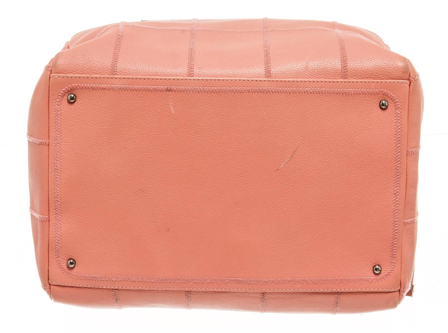 One Chanel Pink Leather Chocolate Bar Shoulder Bag. Item is sold AS-IS. All available information is listed in the description and shown in the photo. Chanel pink leather chocolate bar handbag with pink leather exterior, chocolate bar patterned stitching, pink Chanel patterned fabric lining, two top handles, silver-tone hardware, zipper closure, and one interior zip pocket. There are scratches on the bottom of the bag as shown in photos.