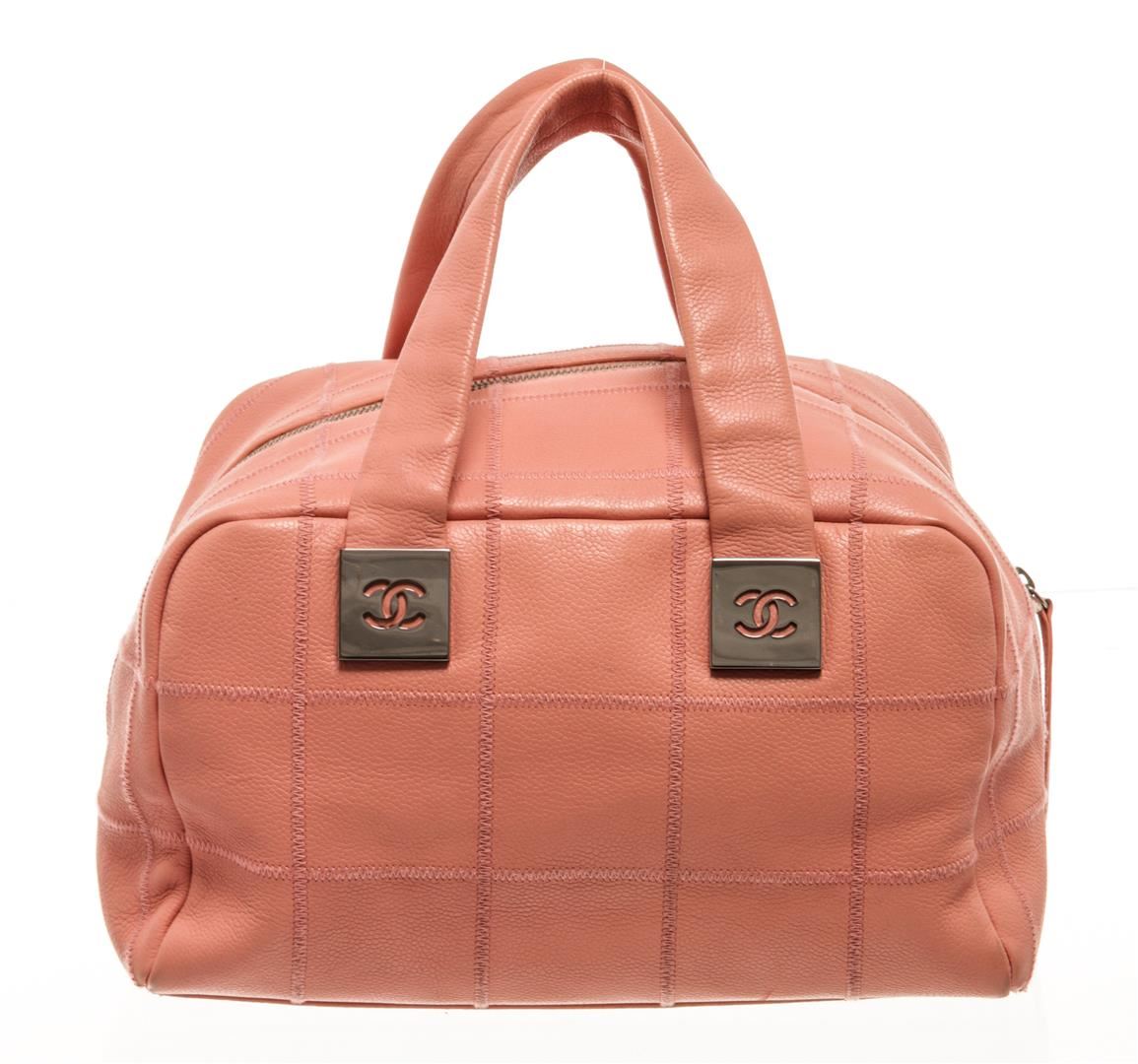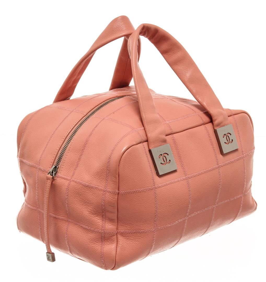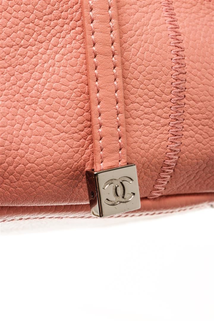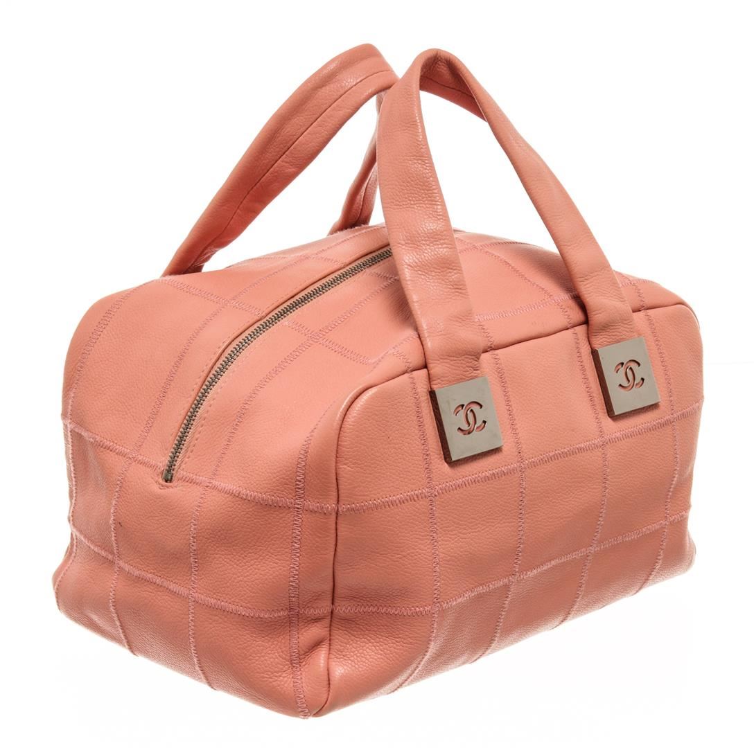 One Chanel Pink Leather Chocolate Bar Shoulder Bag. Item is sold AS-IS. All available information is listed in the description and shown in the photo. Chanel pink leather chocolate bar handbag with pink leather exterior, chocolate bar patterned stitching, pink Chanel patterned fabric lining, two top handles, silver-tone hardware, zipper closure, and one interior zip pocket. There are scratches on the bottom of the bag as shown in photos.