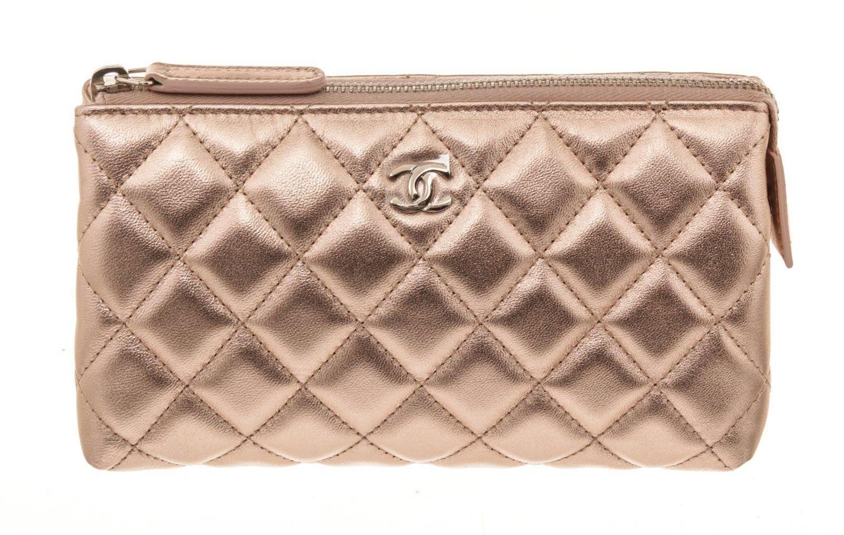 Chanel Pink Metallic Lambskin Pouch with material lambskin, gold-tone hardware, trim leather, interior zip pocket and zipper closure.