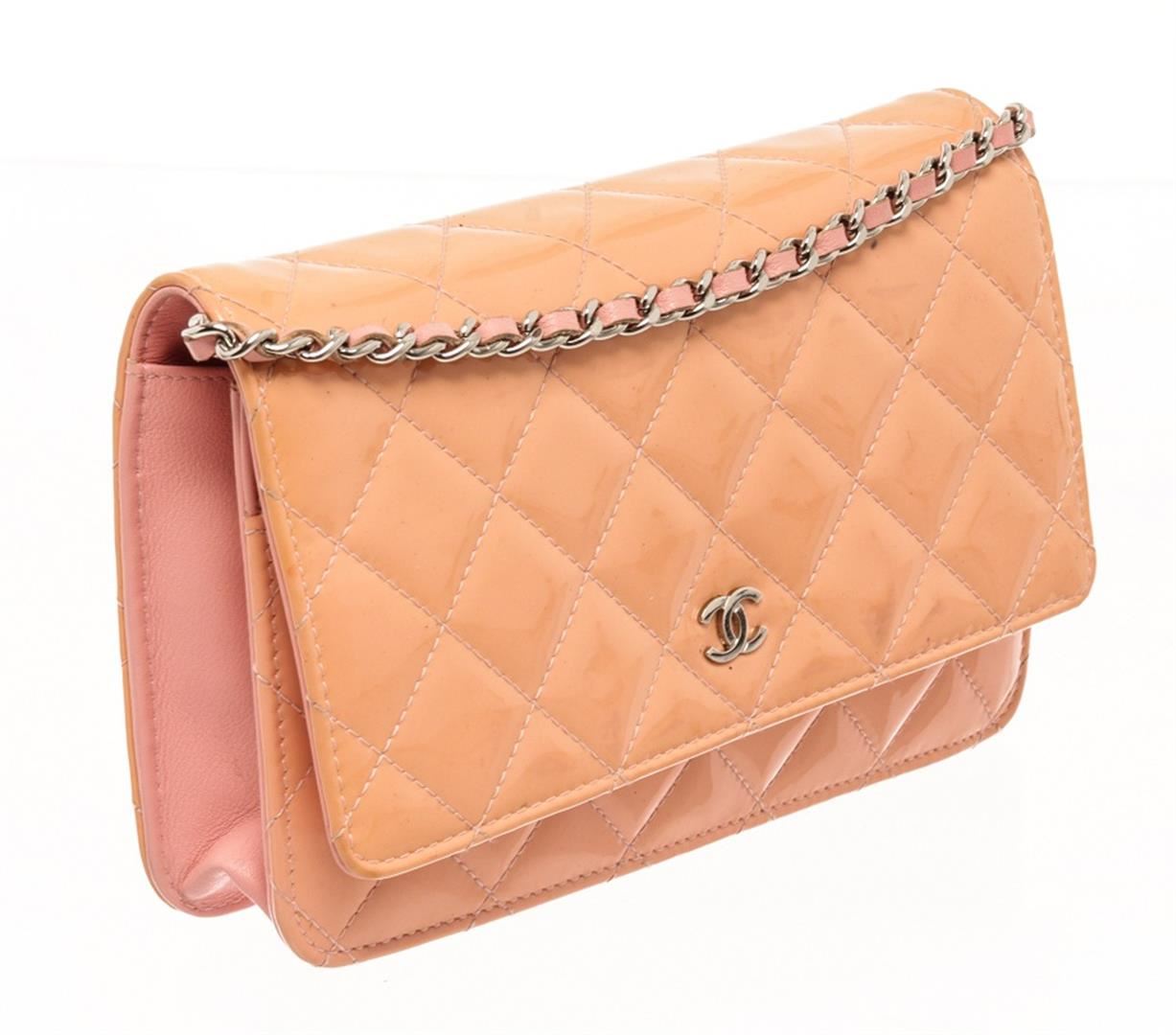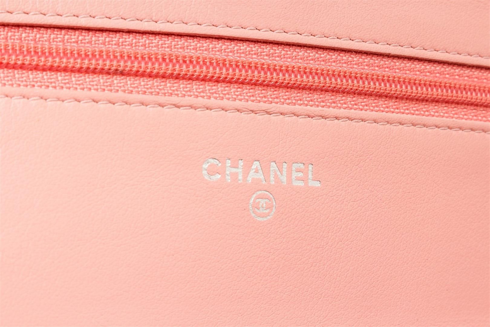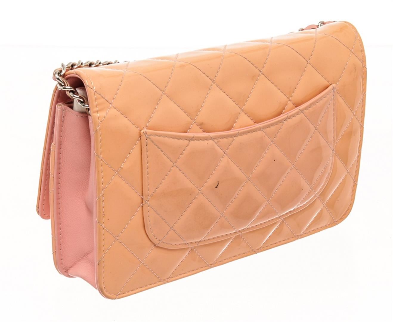 Chanel Pink Patent Leather Wallet on Chain Crossbody Bag. All available information is listed in the description and shown in the photos. chanel pink patent leather wallet on chain crossbody bag with interlocking cc logo, silver-tone hardware, chain-link shoulder strap, single exterior pocket, grosgrain lining & dual interior pockets, snap closure at front. Height: 5.25" Width: 7.75" Depth: 0.75", Shoulder Strap Drop: 15.75" / 13.33 x 19.68 x 1.90 Cm