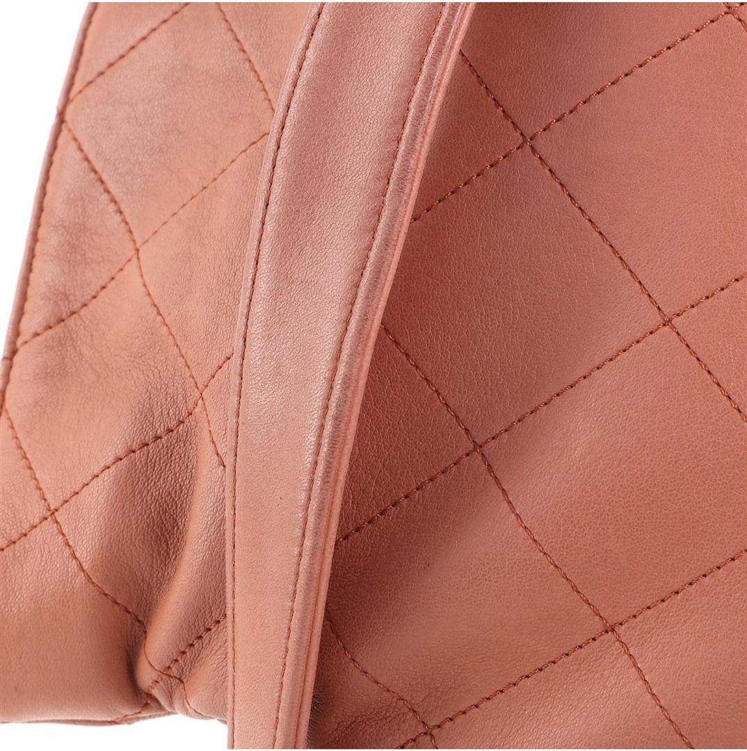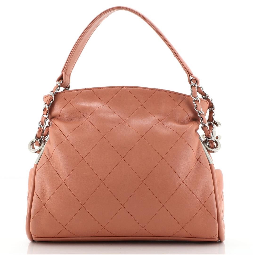 One Chanel Pink Quilted Leather Ultimate Small Soft Hobo Bag. Item is sold AS-IS. All available information is listed in the description and shown in the photo. Chanel Pink Quilted Leather Ultimate Small Soft Hobo Bag features silver-tone hardware, single chain-link and leather shoulder strap with shoulder guard, dual slip pockets with embossed CC accent at sides, tonal logo jacquard lining, single zip pocket at interior and zip closure at top fold-over. Height 8", Width 9.5", Depth 3"