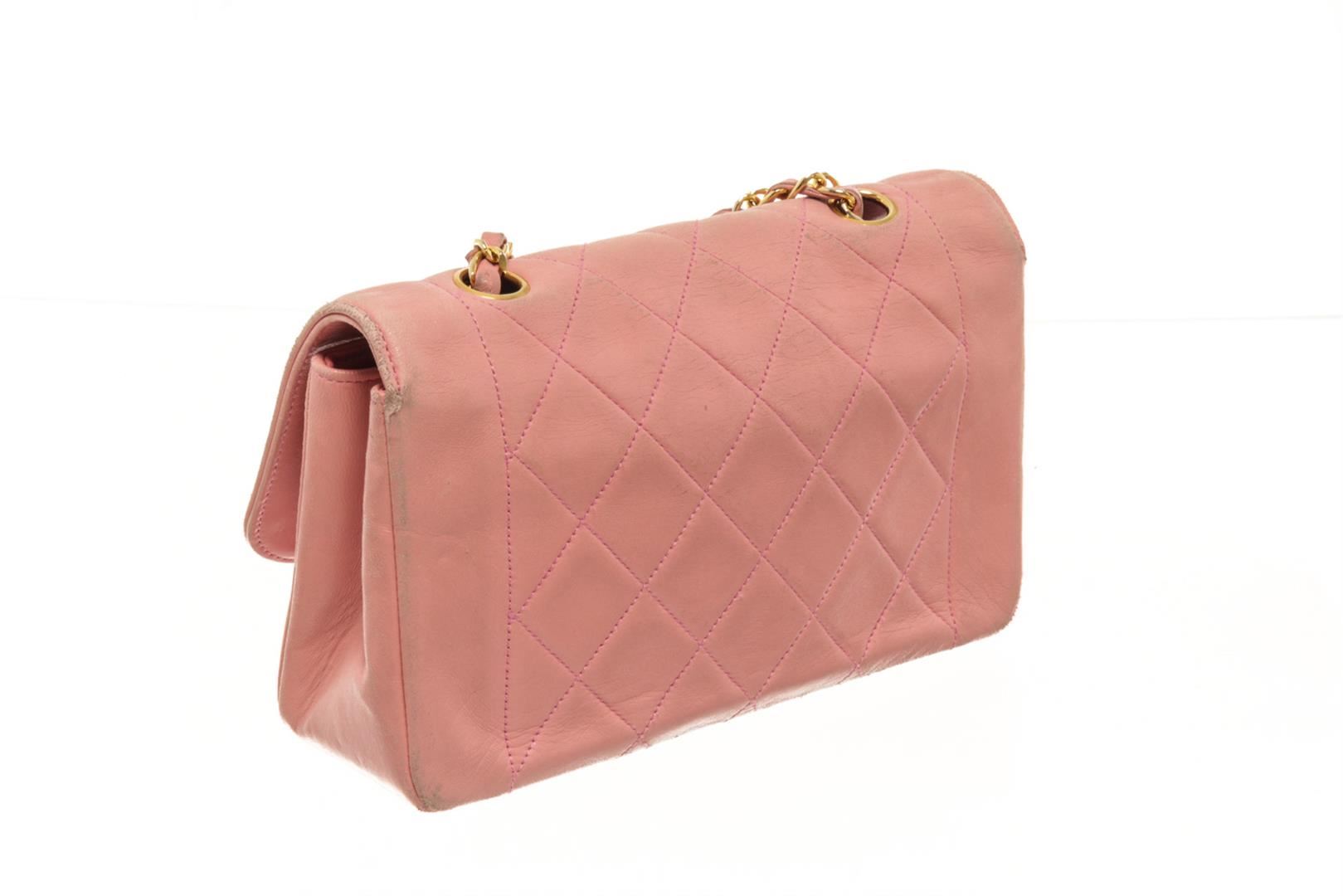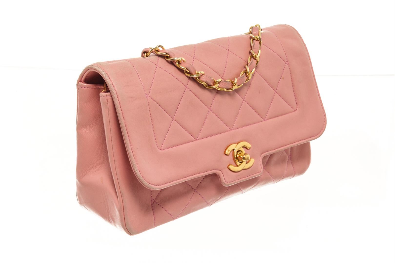 Chanel Pink Quilted lambskin Diana Flap Bag. All available information is listed in the description and shown in the photos. Chanel Pink Quilted Lambskin Diana Flap Bag with chain strap, leather lining, zipper pocket interior, gold hardware and turn lock closure. Height: 4.5", Width: 7.5", Depth: 2" Shoulder Strap Drop: 20" / 11.43 x 19.05 x 5.08 CM, Shoulder Strap Drop: 50.8 CM