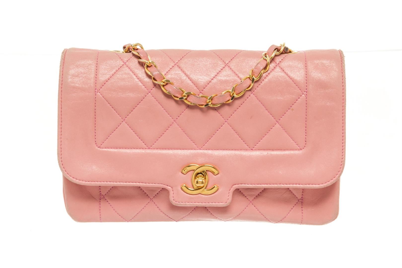 Chanel Pink Quilted lambskin Diana Flap Bag. All available information is listed in the description and shown in the photos. Chanel Pink Quilted Lambskin Diana Flap Bag with chain strap, leather lining, zipper pocket interior, gold hardware and turn lock closure. Height: 4.5", Width: 7.5", Depth: 2" Shoulder Strap Drop: 20" / 11.43 x 19.05 x 5.08 CM, Shoulder Strap Drop: 50.8 CM