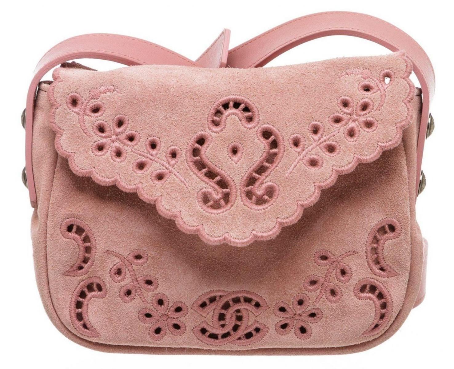 Chanel Pink Suede Paris-Edinburgh Mini Highland Messenger Bag. Pink suede Chanel Paris-Edinburgh Mini Highlander messenger bag with antiqued silver-tone hardware, single shoulder strap, crochet floral pattern at front face, tonal suede lining and flap clo