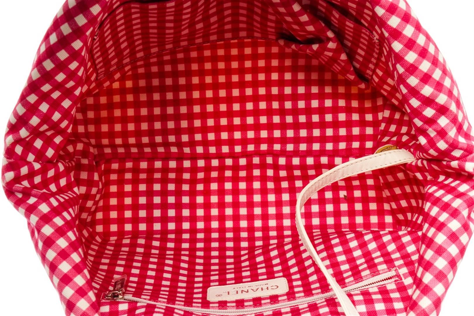 Chanel Pink White Canvas Leather Cruise Line Tote Bag. All available information is listed in the description and shown in the photos. Chanel Pink White Canvas Leather Cruise Line Tote Bag with fuchsia pink/white, canvas, check print, signature interlocking cc logo all over, two rounded top handles, magnetic fastening, main compartment, internal zip-fastening pocket, internal logo patch, silver-tone hardware. Height: 7.87" Width: 13.77" Depth: 5.11", Handle Drop: 3.54" / 20 x 35 x 13 Cm