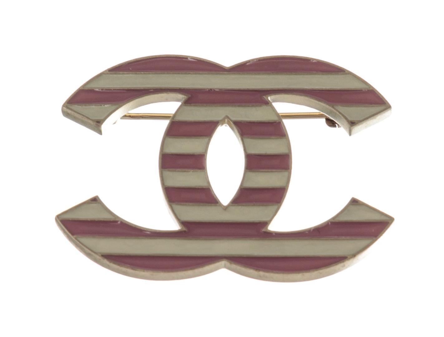 One Chanel Pink White Striped CC Enamel Brooch. Item is sold AS-IS. All available information is listed in the description and shown in the photo. Pink and white stripe Chanel CC enamel brooch features CC logo and gold-tone hardware.