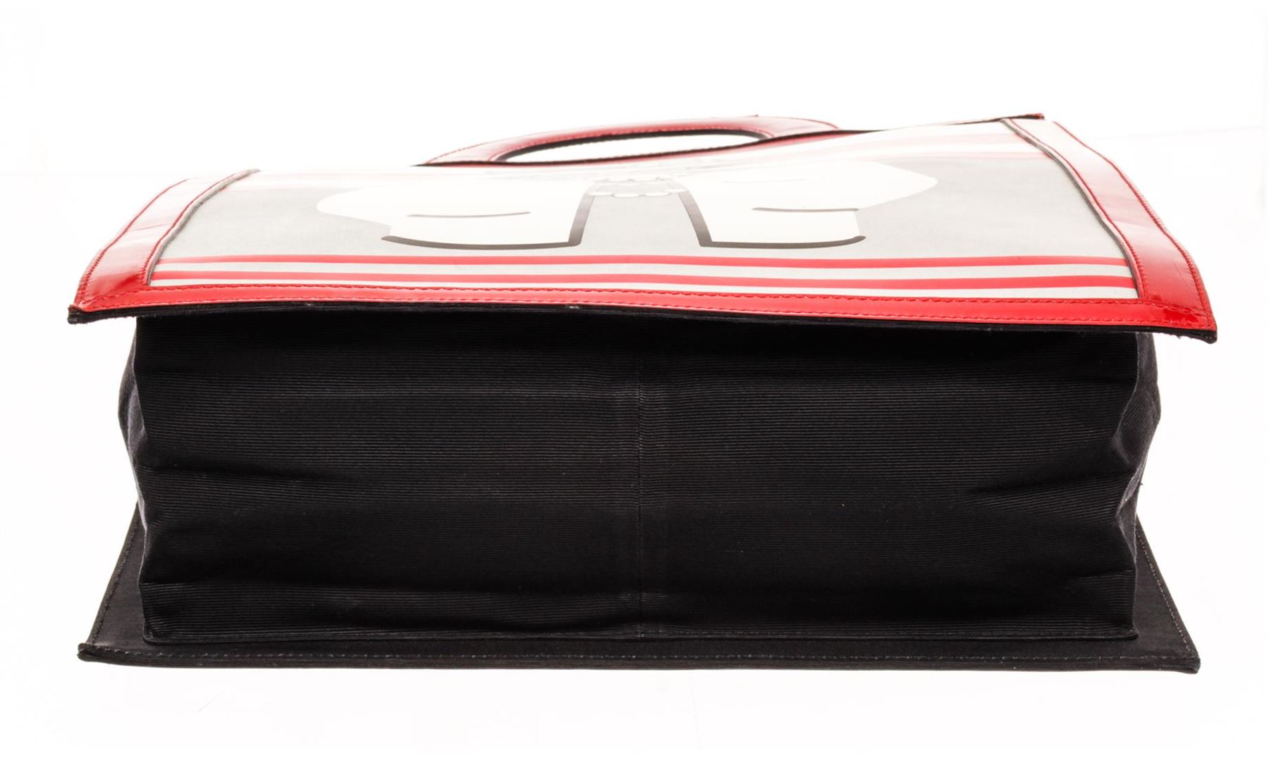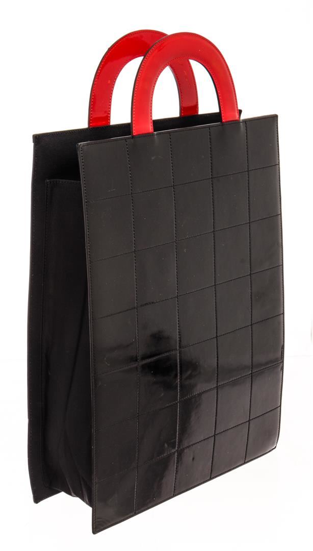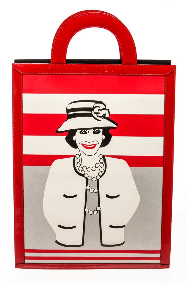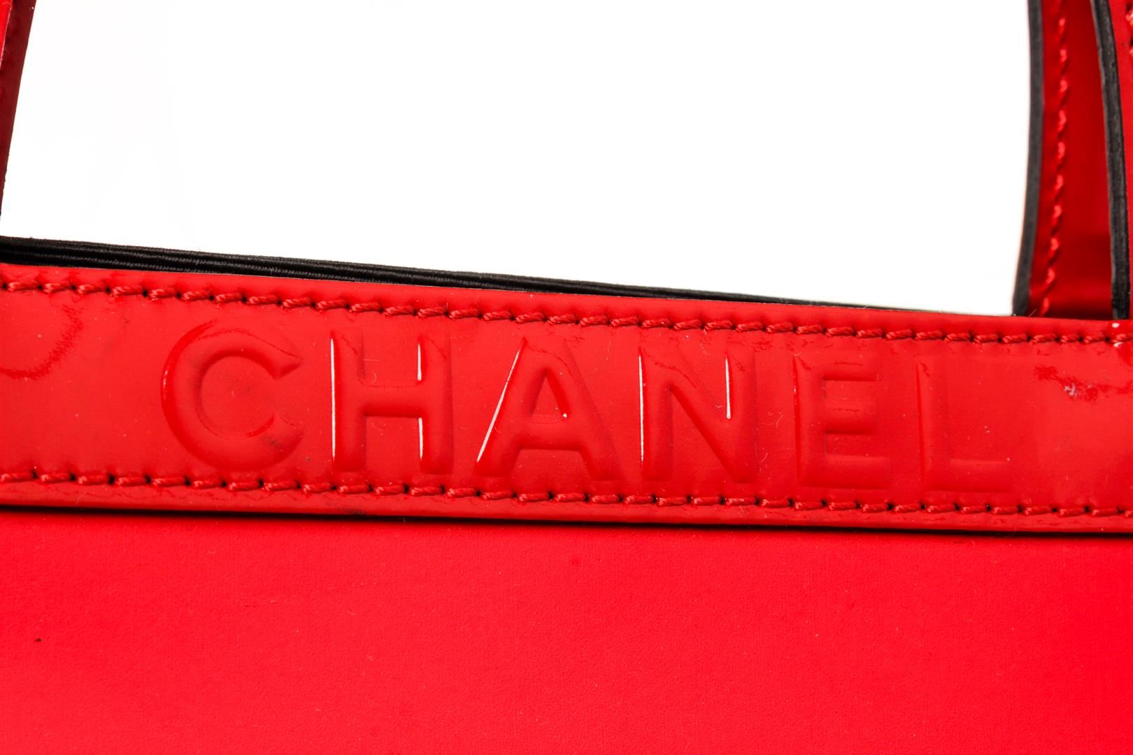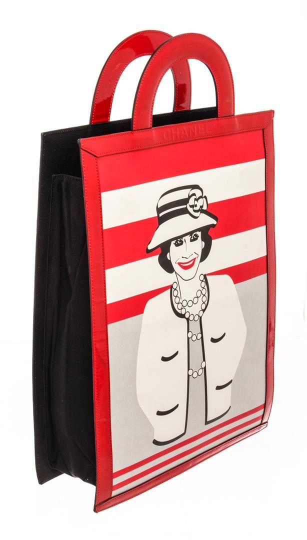 Chanel Portrait Tote Tote. Brand: Chanel, Style: Portrait Tote, Type: Tote, Exterior color: Red/White, Exterior material: Patent Leather, Interior color: Black, Interior material: Canvas, Length: 12 5/8", Width: 1", Height: 16 3/4". Item is sold AS-IS and