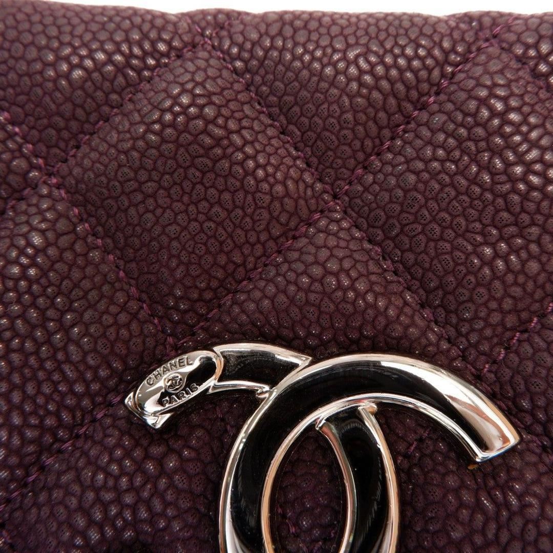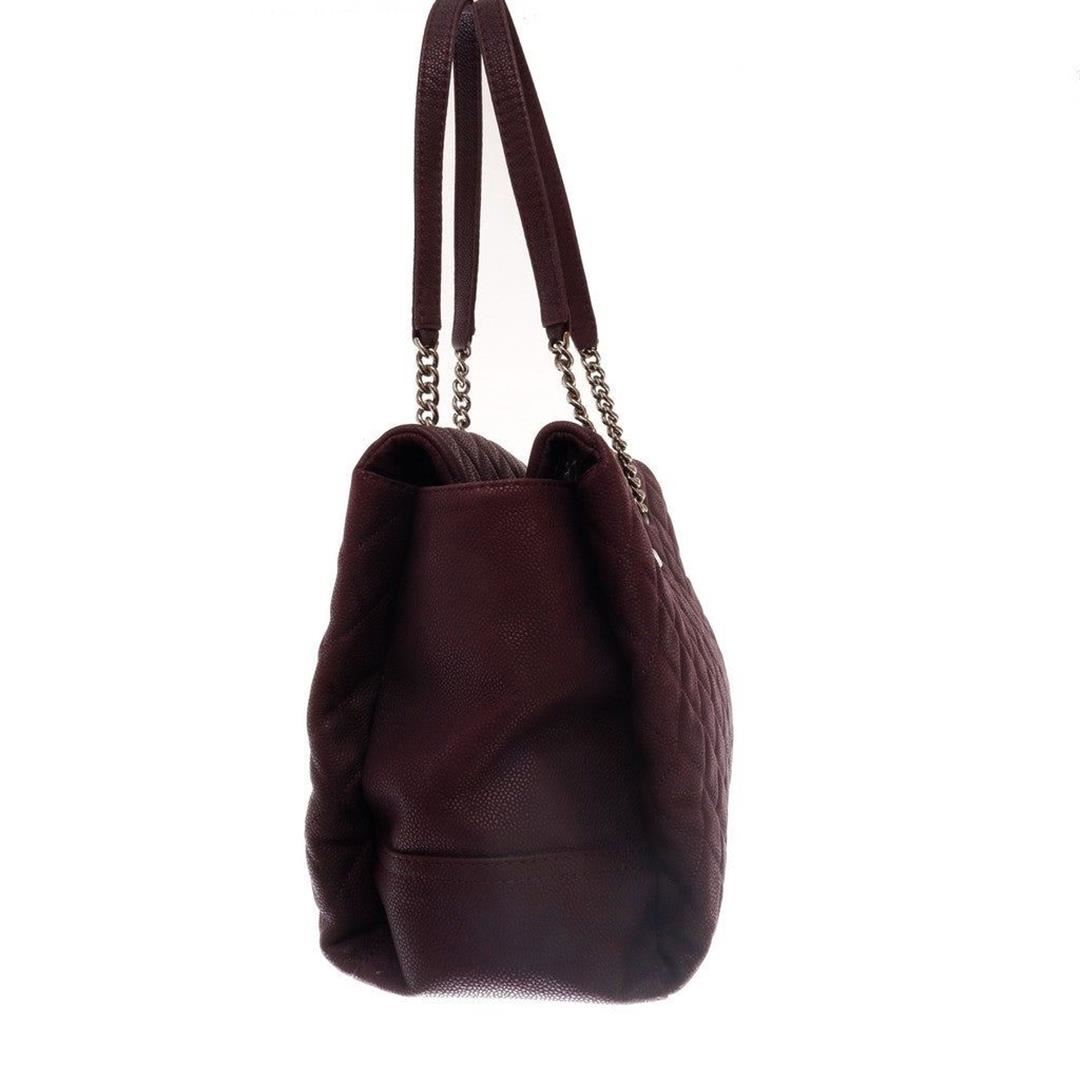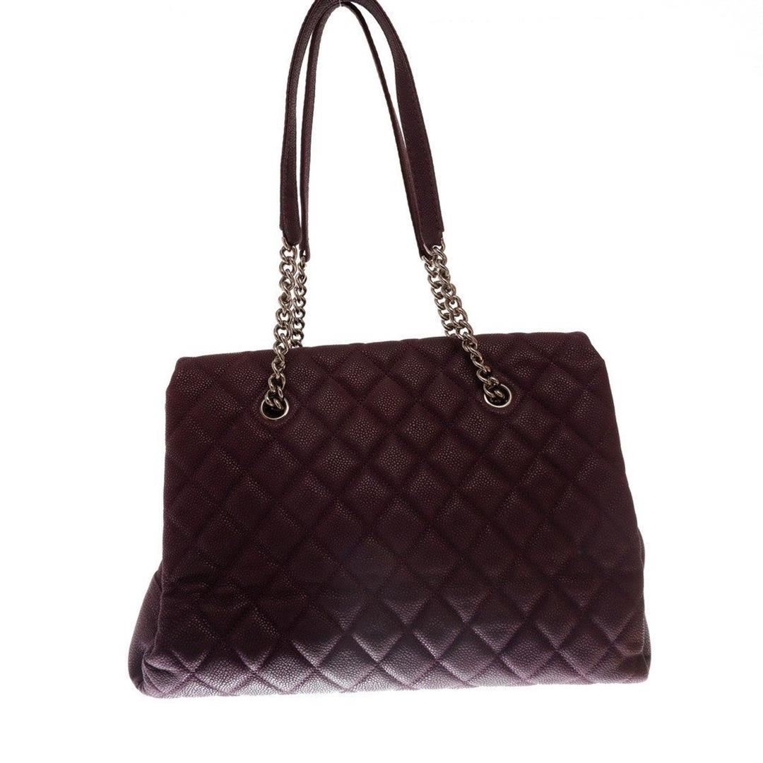 Purple quilted caviar leather Chanel shopping bag features gold-tone CC logo in the center, chain and flat leather shoulder strap, flap closure, one zipper pocket, gold-tone hardware.