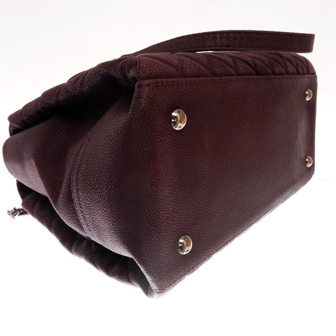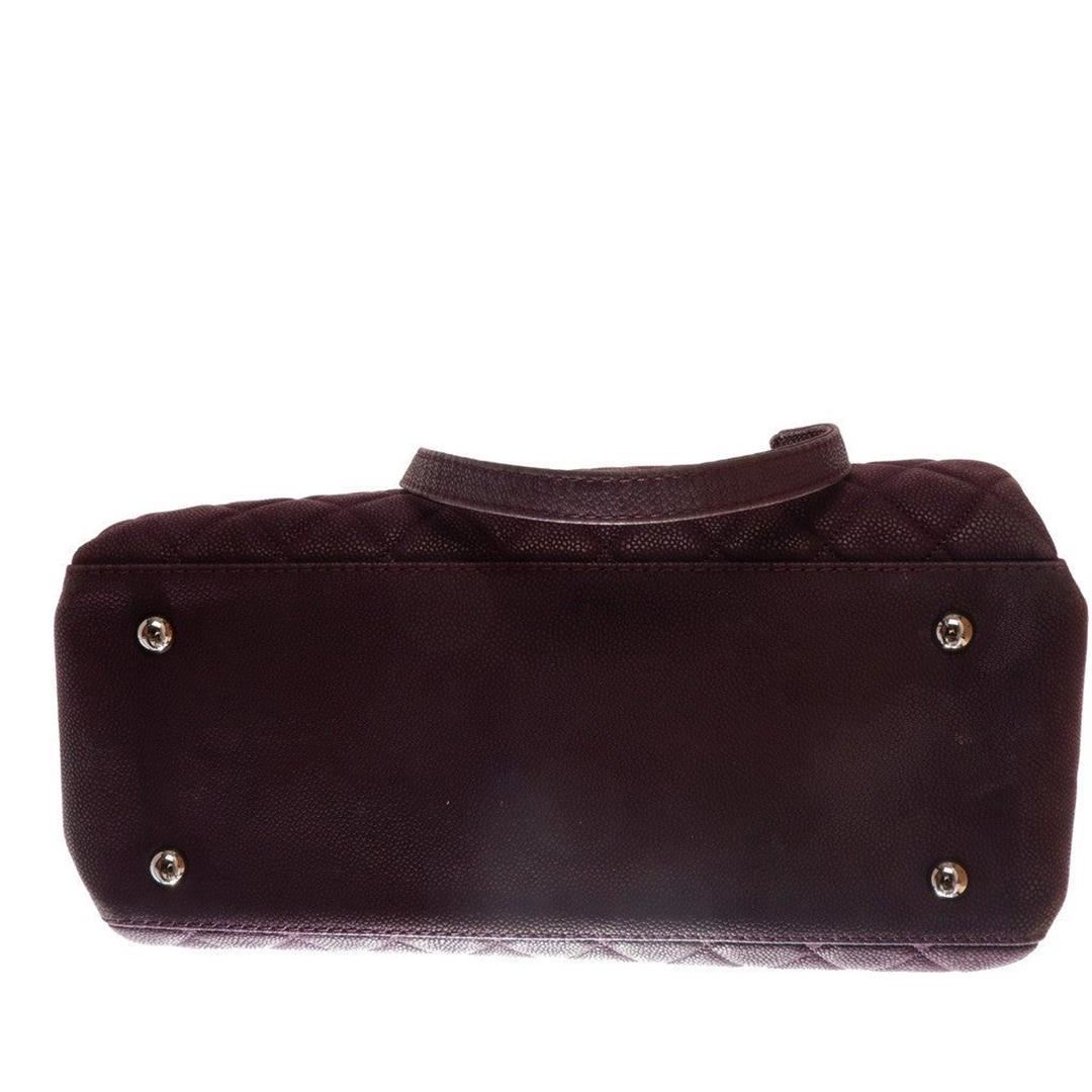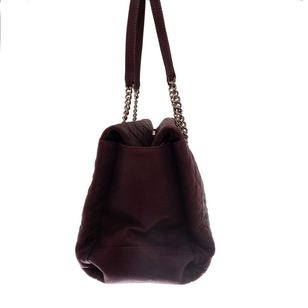 Purple quilted caviar leather Chanel shopping bag features gold-tone CC logo in the center, chain and flat leather shoulder strap, flap closure, one zipper pocket, gold-tone hardware.