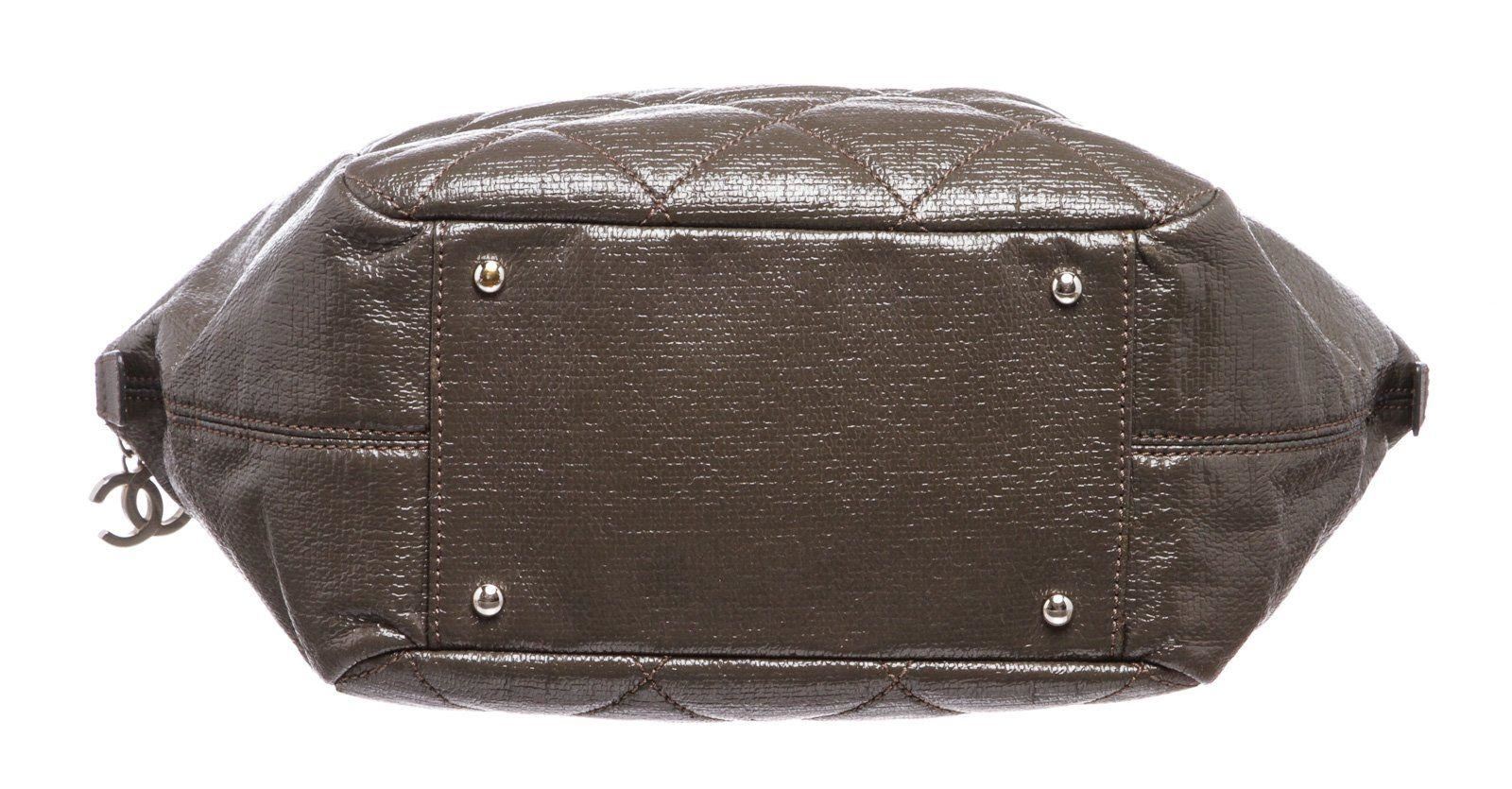 Chanel Quilted Bowling Handbag Grey Patent Leather. Brand: Chanel, Style: Quilted Bowling, Type: Handbag, Exterior Color: Grey, Exterior Material: Patent Leather, Exterior Pockets: Two, Interior Color: Black, Interior Material: Nylon, Interior Pockets: Three, Closure: Zip closure, Handle/Strap Type: Leather Shoulder Straps, Length: 12", Width: 6", Height: 11", Handle Drop: 6". Condition: Majority of exterior is peeling. Additional Information: Silver Hardware. Item is sold AS-IS and all information pertaining to this lot is available in the photos or this description.