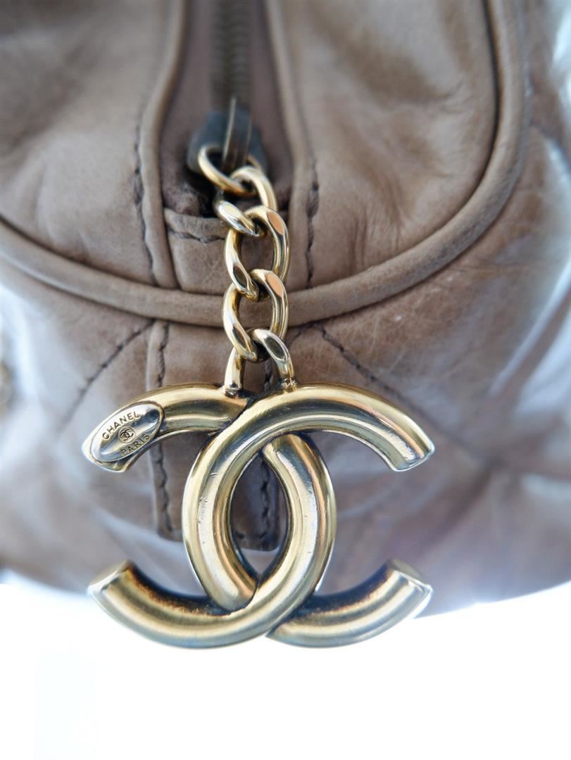 Chanel Quilted Castle Rock Brown Bowler Bag. All available information is listed in the description and shown in the photos. Brown quilted calfskin Chanel Castle Rock bowler bag features dual rolled leather top handles, dual chain-link shoulder straps with leather pads, CC zip pull charm and gold-tone hardware, zip closure opens to a maroon fabric interior with zip and slip pockets. 12" x 5.5" x 8" / 30.48cm x 13.97cm x 20.32cm