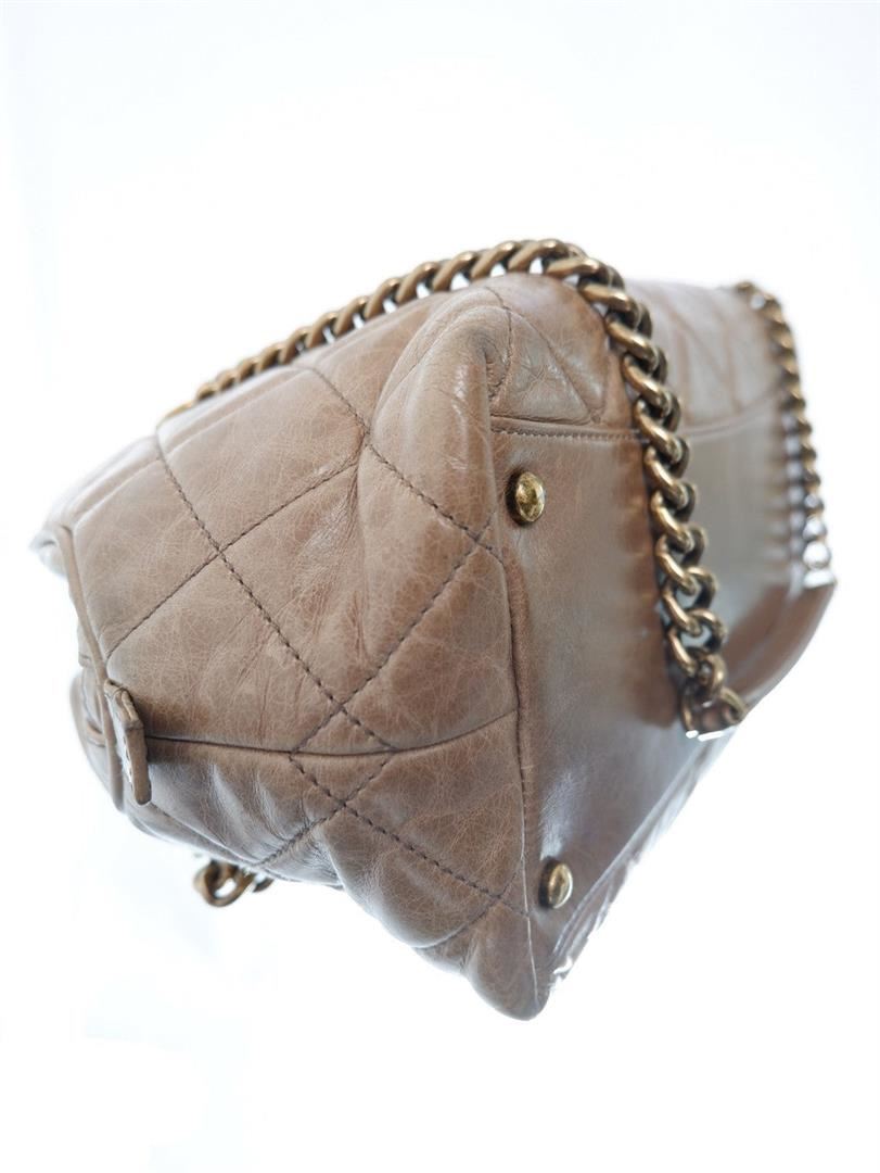 Chanel Quilted Castle Rock Brown Bowler Bag. All available information is listed in the description and shown in the photos. Brown quilted calfskin Chanel Castle Rock bowler bag features dual rolled leather top handles, dual chain-link shoulder straps with leather pads, CC zip pull charm and gold-tone hardware, zip closure opens to a maroon fabric interior with zip and slip pockets. 12" x 5.5" x 8" / 30.48cm x 13.97cm x 20.32cm