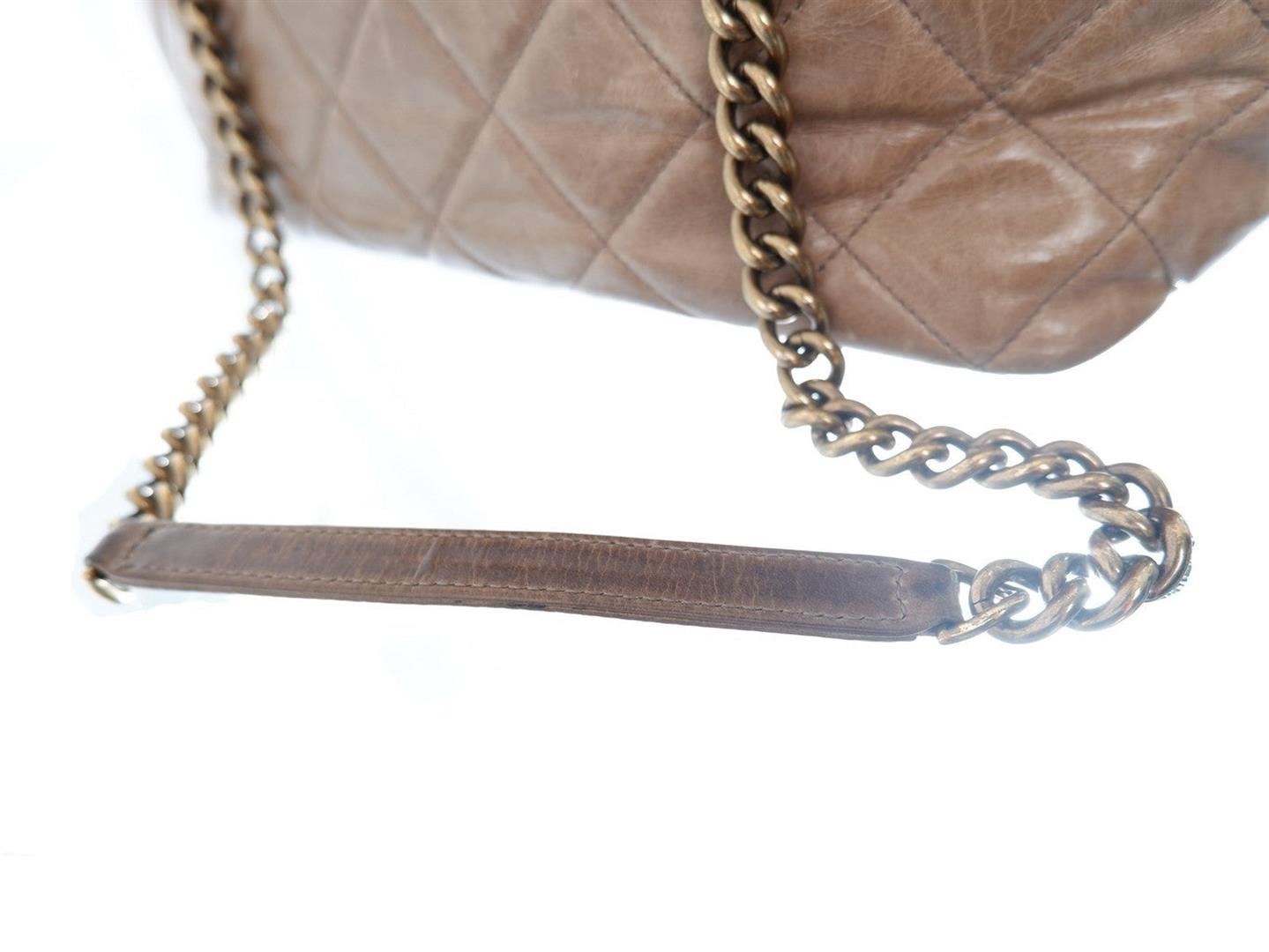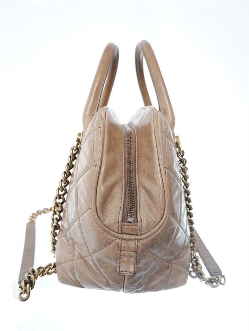 Chanel Quilted Castle Rock Brown Bowler Bag. All available information is listed in the description and shown in the photos. Brown quilted calfskin Chanel Castle Rock bowler bag features dual rolled leather top handles, dual chain-link shoulder straps with leather pads, CC zip pull charm and gold-tone hardware, zip closure opens to a maroon fabric interior with zip and slip pockets. 12" x 5.5" x 8" / 30.48cm x 13.97cm x 20.32cm