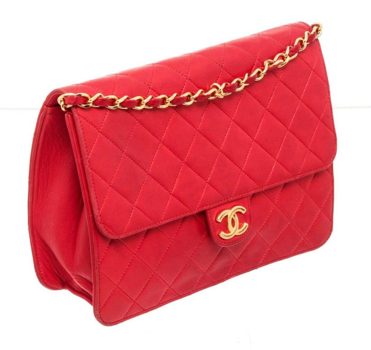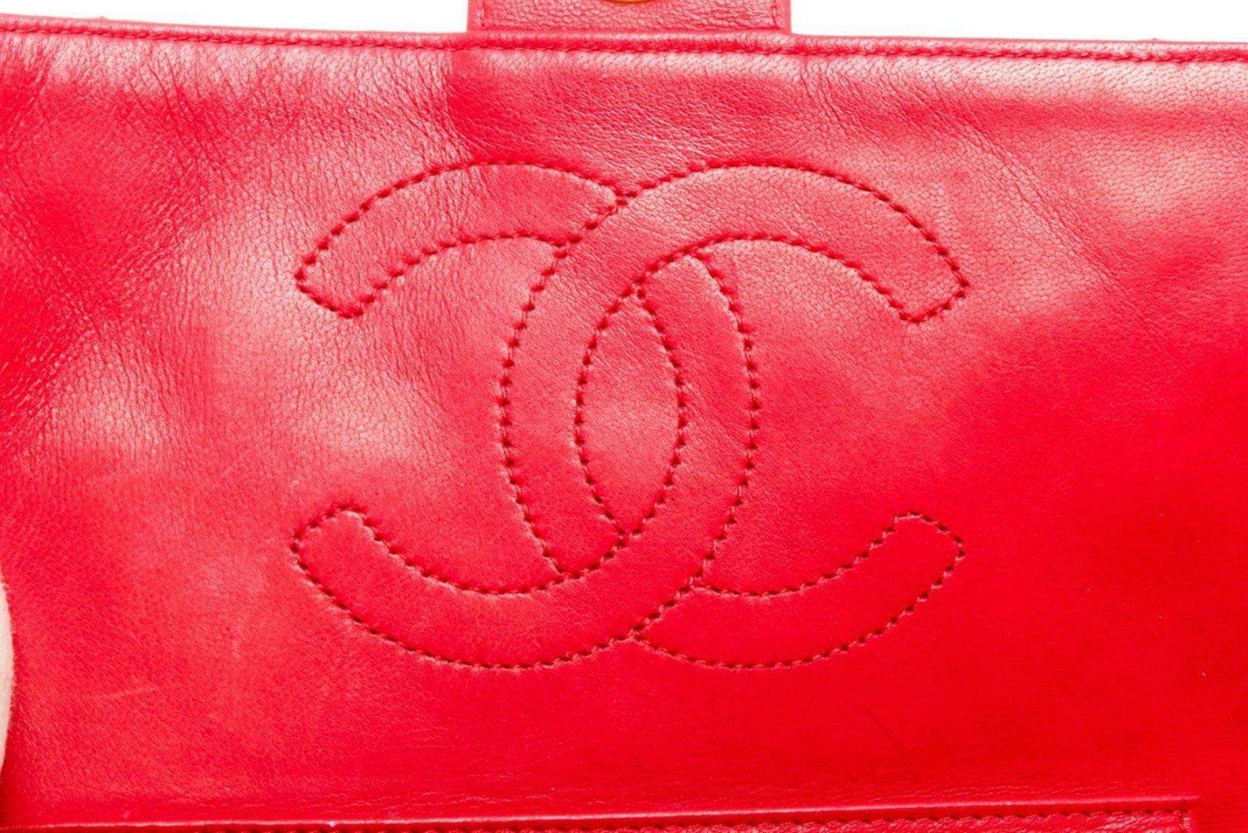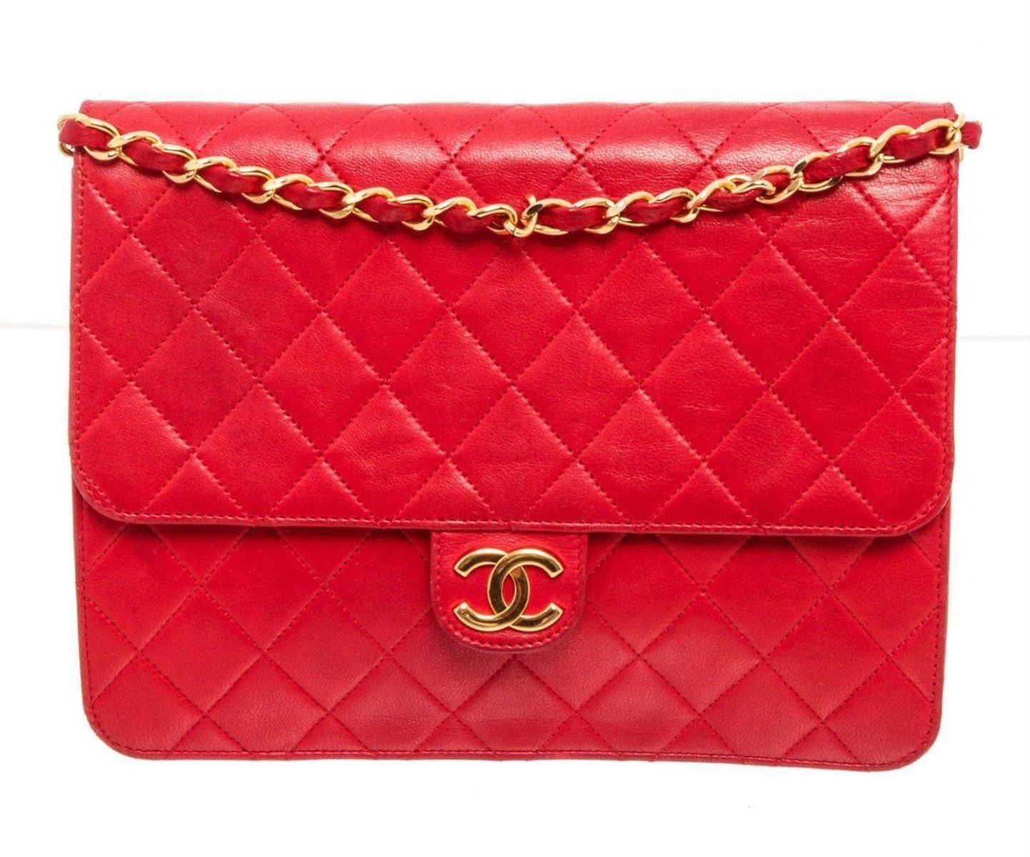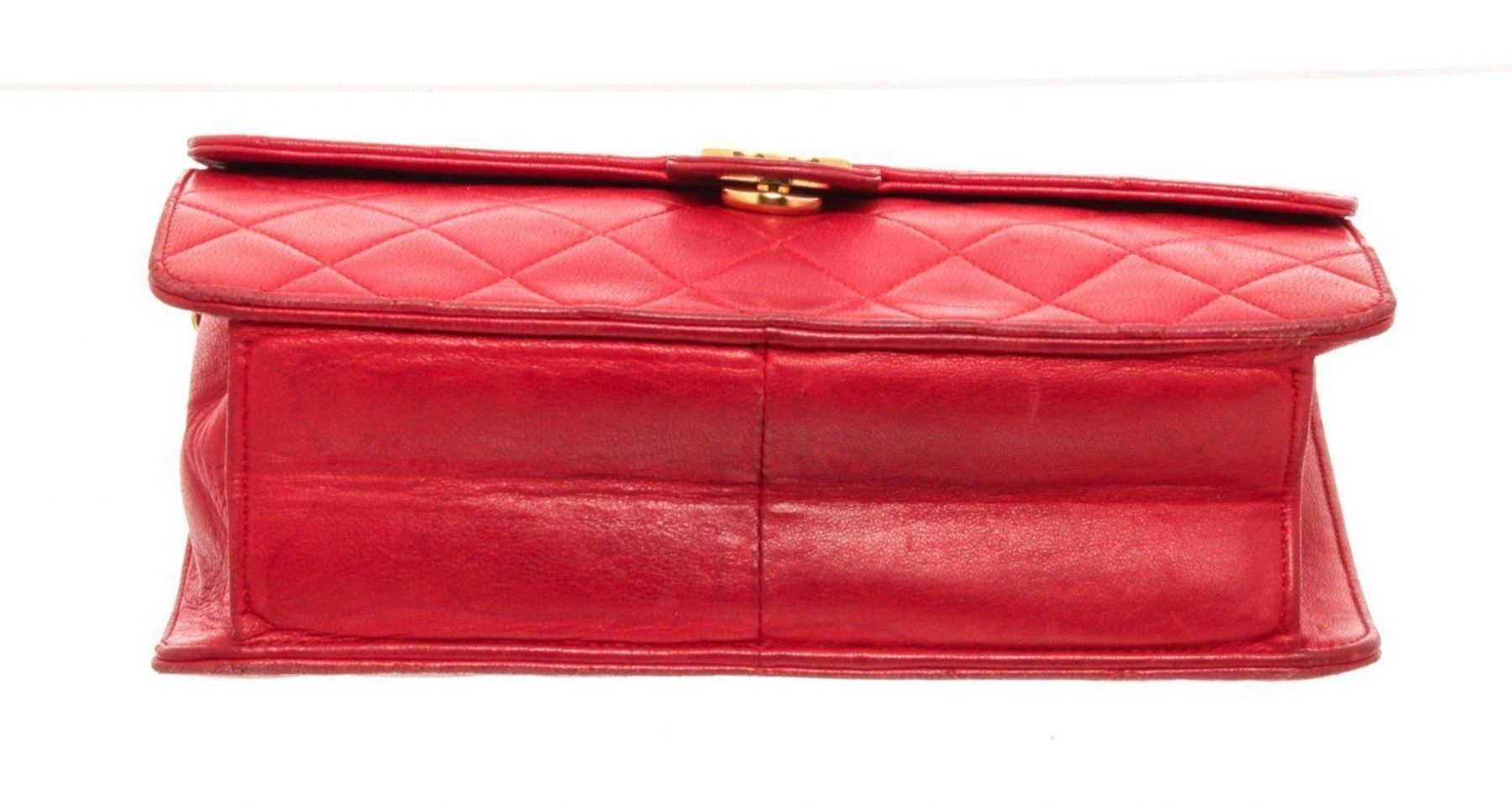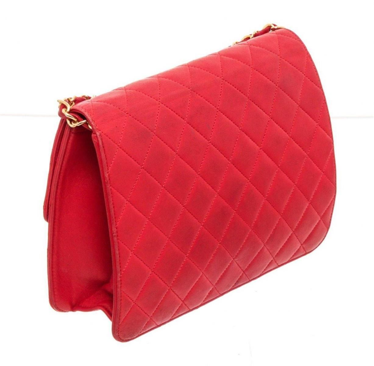 Chanel Red Lambskin Half Flap Shoulder Bag with material leather, gold-tone hardware, interior zip pockets, chain shoulder strap and flap closure. MEASUREMENTS: Length 7.5 in / 19 cm Width 11.5 in / 29 cm Height 2.25 in / 6 cm Condition: Pre-Owned Good overall, please see photographs for detail.
